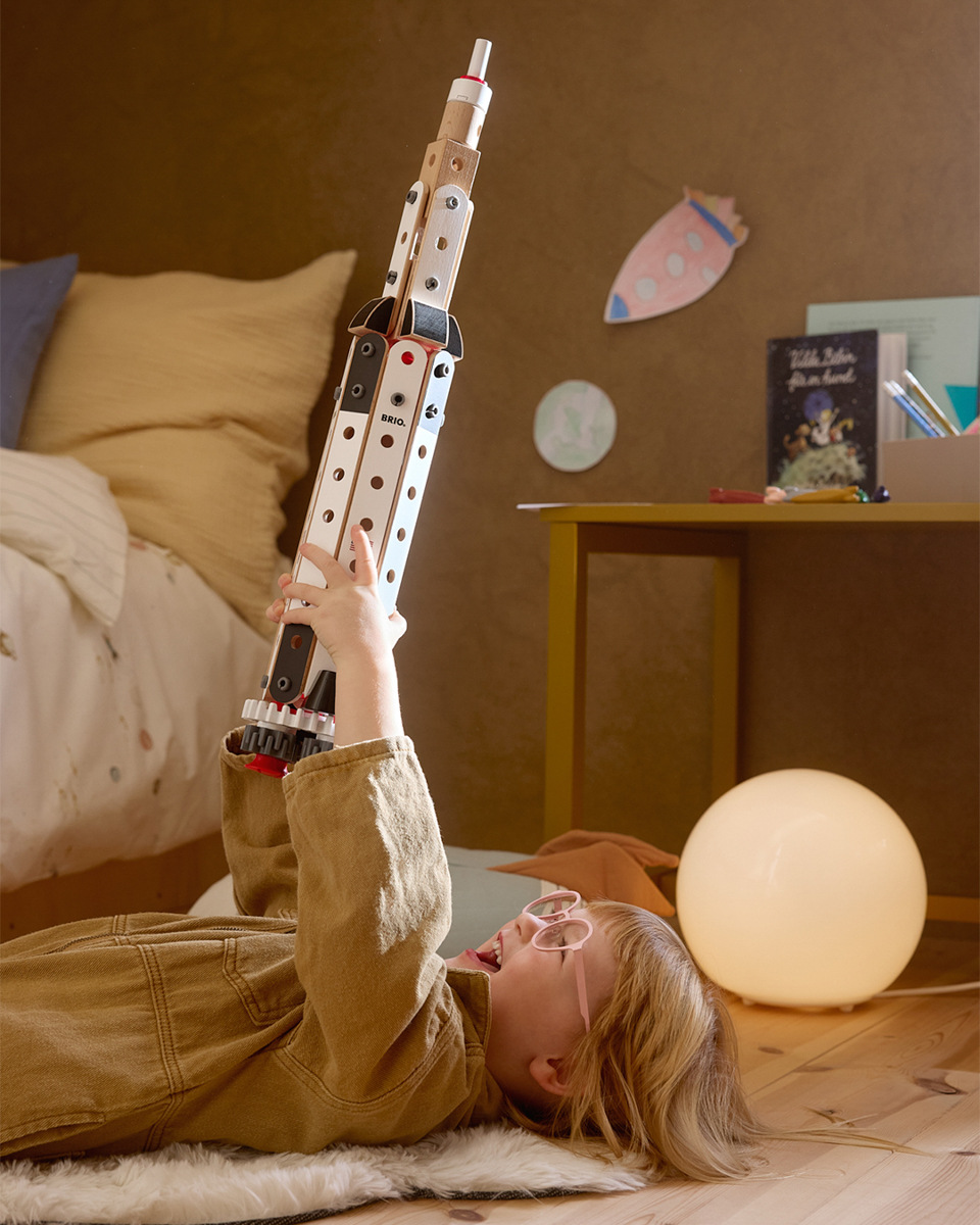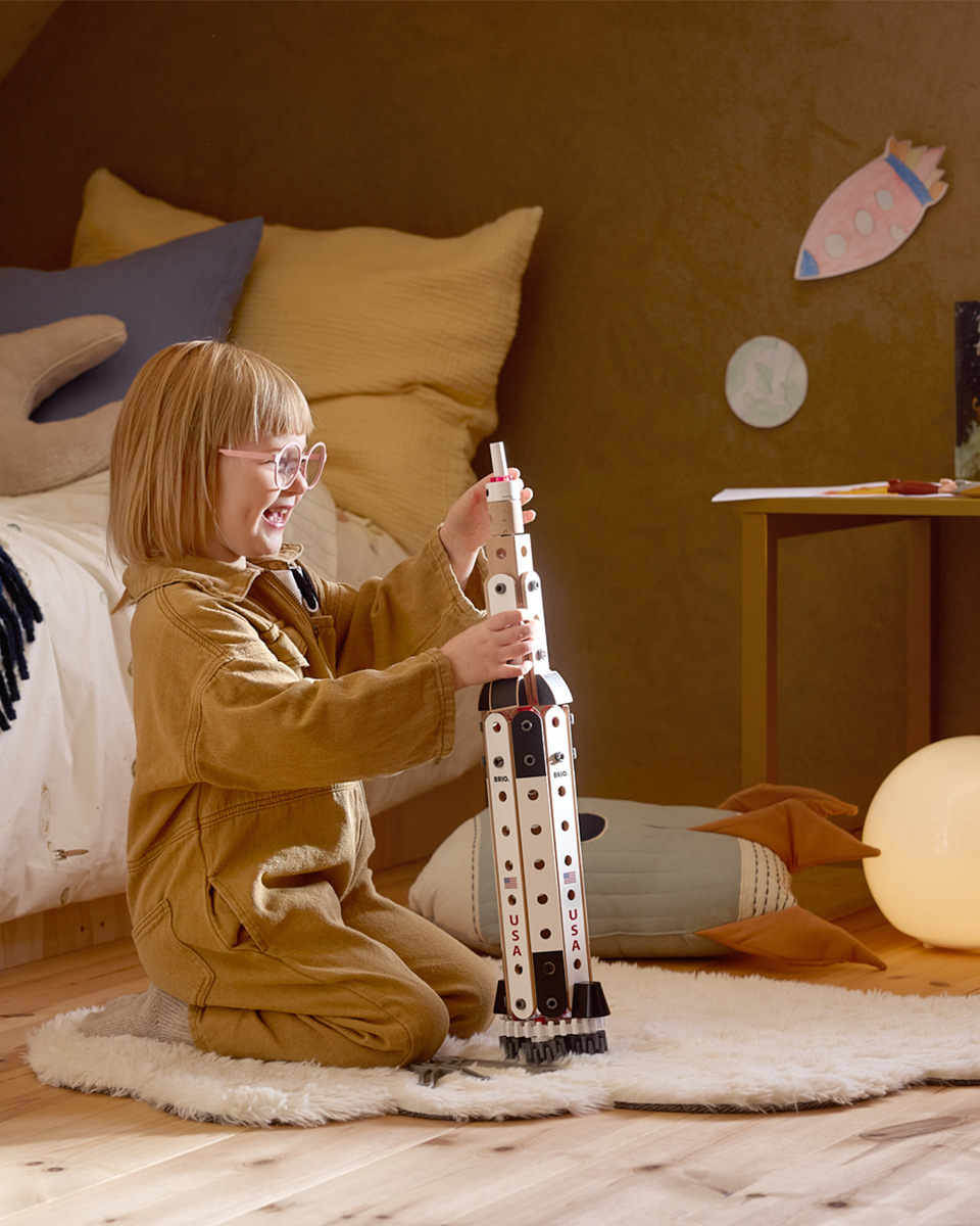 Sestavte si vesmírný projekt se stavebnicí BRIO Builder Apollo Saturn V. Raketa inspirovaná NASA má výšku 60 cm, skládá se z 91 dílků a malým inženýrům přiblíží výzkum vesmíru. Raketa má 3 stupně – 1. nese hlavní motory, 2. je uprostřed a 3. má blikající špičku. Přestavte ji na raketoplán či letadlo nebo díly využijte k neomezeným kreativním hrám. Stejně jako všechny stavebnice BRIO Builder i tato hračka podporuje otevřenou a nápaditou hru – ideální pro malé inženýry a průzkumníky vesmíru. Builder Apollo Saturn V obsahuje 91 dílů: 12 x dřevěný profil, 11x dřevěný blok, 9 x ozubené kolo, 5 x hřebík, 1x světlo, 1x kleště, 1x klíč, různé herní díly a 1x inspirační letáček. Baterie: 2 x LR44 (baterie jsou součástí balení). Rozměry balení: 30 x 31 x 7 cm. Věk: 3+