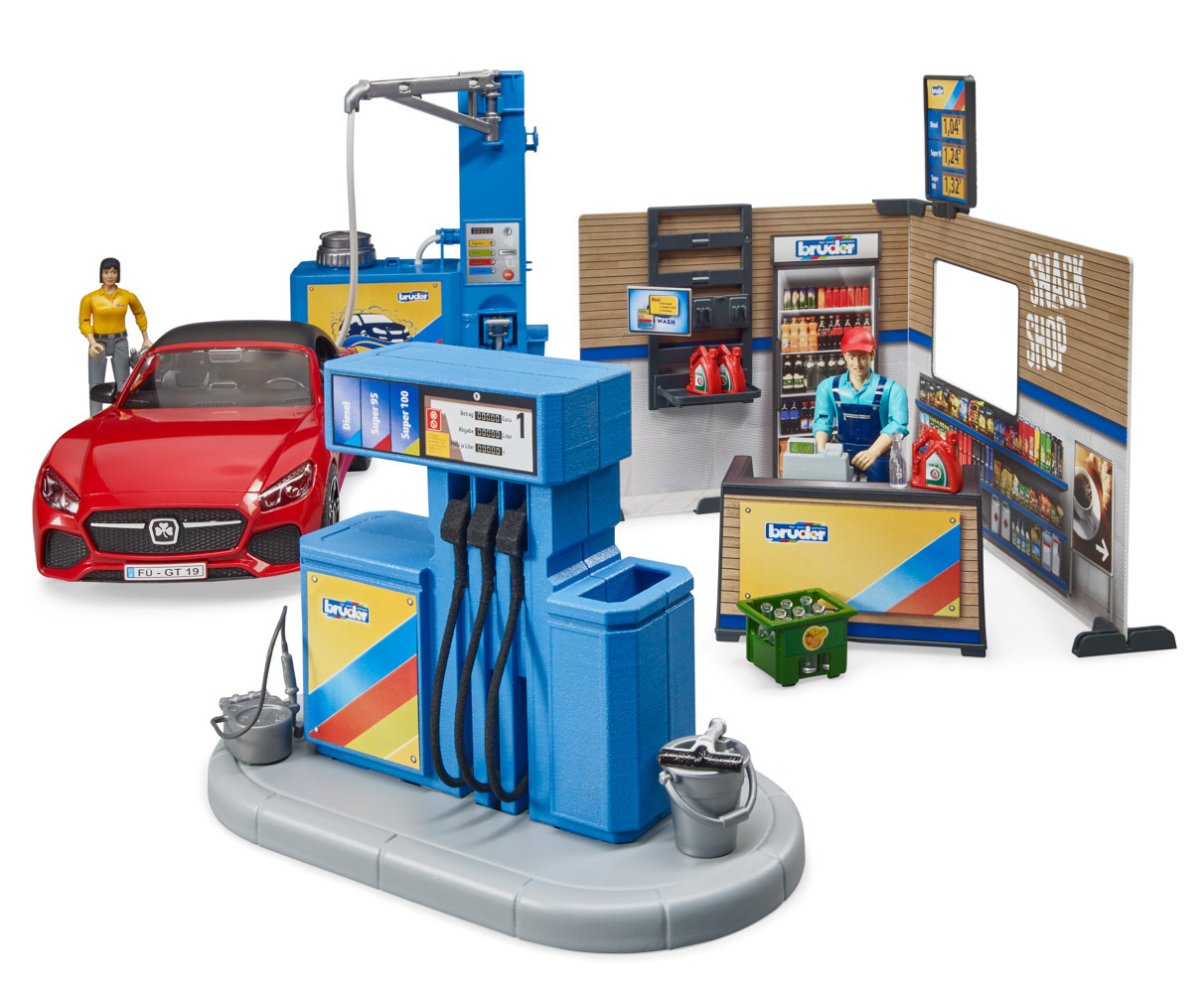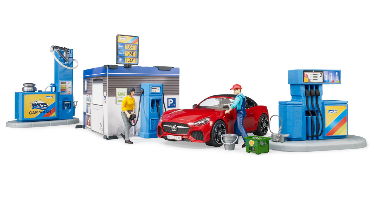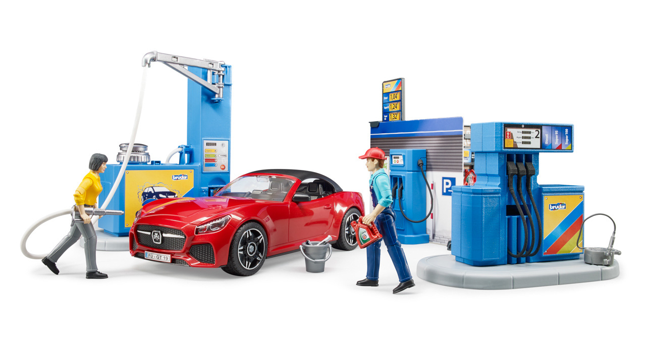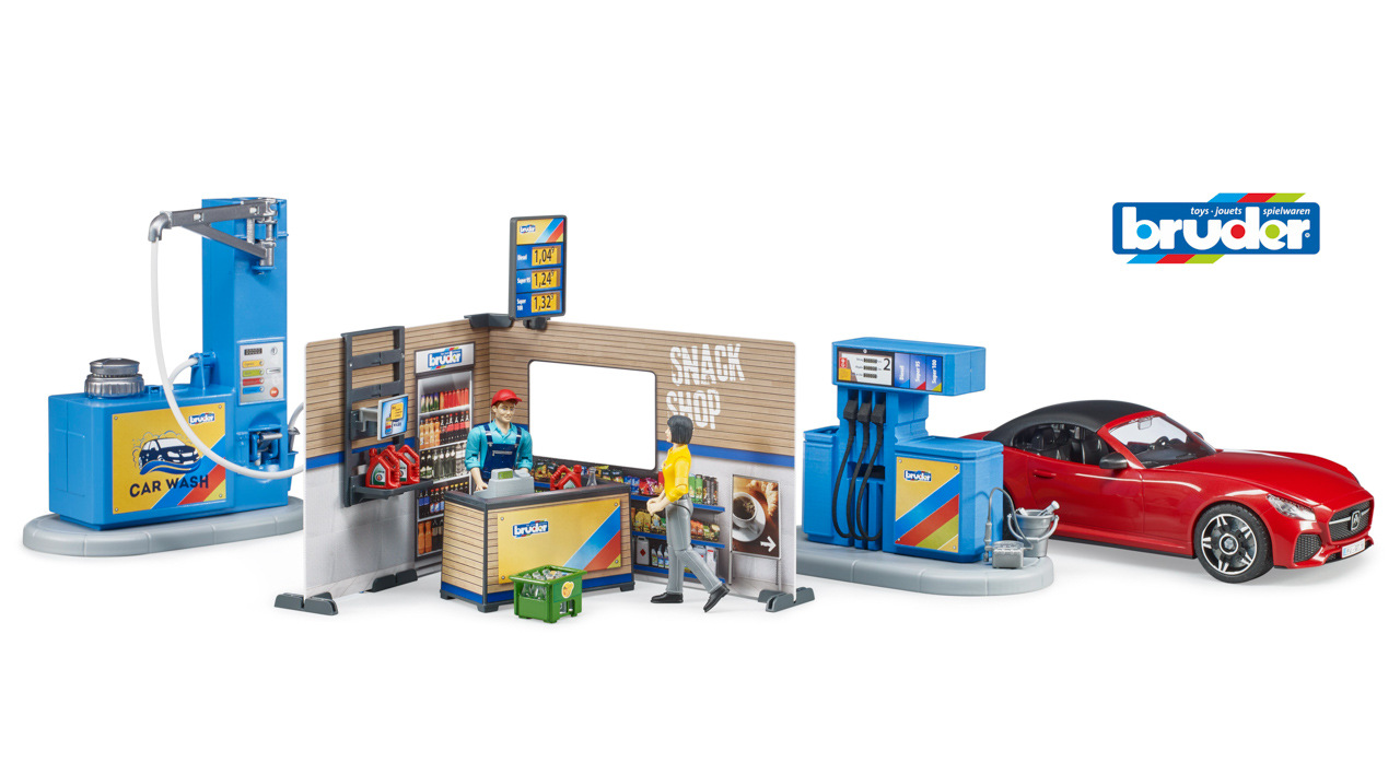 Bworld, to je herní svět BRUDER. Skládá se z pohybujících se figurek, zvířat, doplňků, tematických sad a je zařazen do známých kategorií BRUDER. Ať už jako řidič, jezdec, obsluha čerpací stanice, lékař na ošetřovně nebo servis v motocyklové dílně, sady z Bworld nabízejí spoustu zábavy a jsou ideálním rozšířením světa vozidel. Všechna vozidla potřebují tankovat a občas i umýt. K tomu slouží nová, skvěle vybavená čerpací stanice Bworld. Na čerpací stanici jsou k dispozici všechny běžné druhy paliva včetně nabíjecí stanice pro e-vozidla. Obsluha čerpací stanice pracuje v moderní prodejně s monitorem a pokladním systémem. K čištění vozidel je zde připravena plně funkční myčka. Vodu lze naplnit do integrované nádrže. Tlak se zvyšuje pomocí vestavěné ruční vzduchové pumpy a čištění vodou lze spustit/vypnout vypínačem. BRUDER Roadster s odnímatelnou střechou a systémem výměny kol včetně figurky zákazníka doplňují tuto úžasnou sadu. Hračka není vhodná pro děti mladší 3 let. Vhodné pro hru uvni