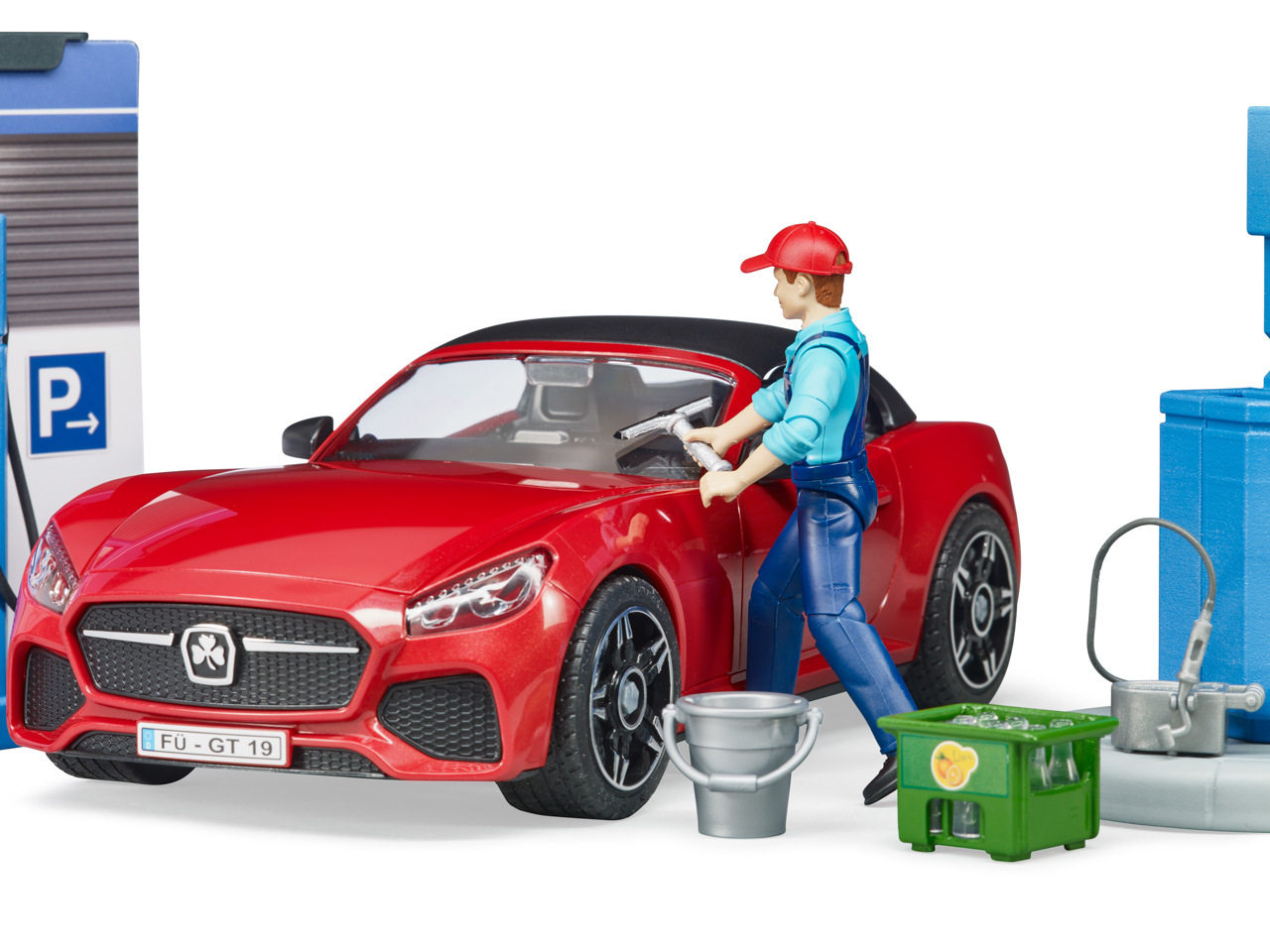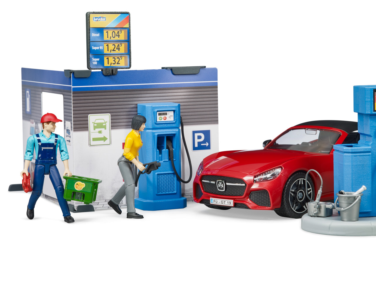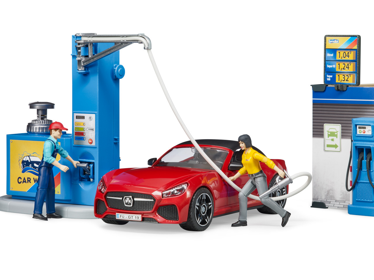 Bworld, to je herní svět BRUDER. Skládá se z pohybujících se figurek, zvířat, doplňků, tematických sad a je zařazen do známých kategorií BRUDER. Ať už jako řidič, jezdec, obsluha čerpací stanice, lékař na ošetřovně nebo servis v motocyklové dílně, sady z Bworld nabízejí spoustu zábavy a jsou ideálním rozšířením světa vozidel. Všechna vozidla potřebují tankovat a občas i umýt. K tomu slouží nová, skvěle vybavená čerpací stanice Bworld. Na čerpací stanici jsou k dispozici všechny běžné druhy paliva včetně nabíjecí stanice pro e-vozidla. Obsluha čerpací stanice pracuje v moderní prodejně s monitorem a pokladním systémem. K čištění vozidel je zde připravena plně funkční myčka. Vodu lze naplnit do integrované nádrže. Tlak se zvyšuje pomocí vestavěné ruční vzduchové pumpy a čištění vodou lze spustit/vypnout vypínačem. BRUDER Roadster s odnímatelnou střechou a systémem výměny kol včetně figurky zákazníka doplňují tuto úžasnou sadu. Hračka není vhodná pro děti mladší 3 let. Vhodné pro hru uvni