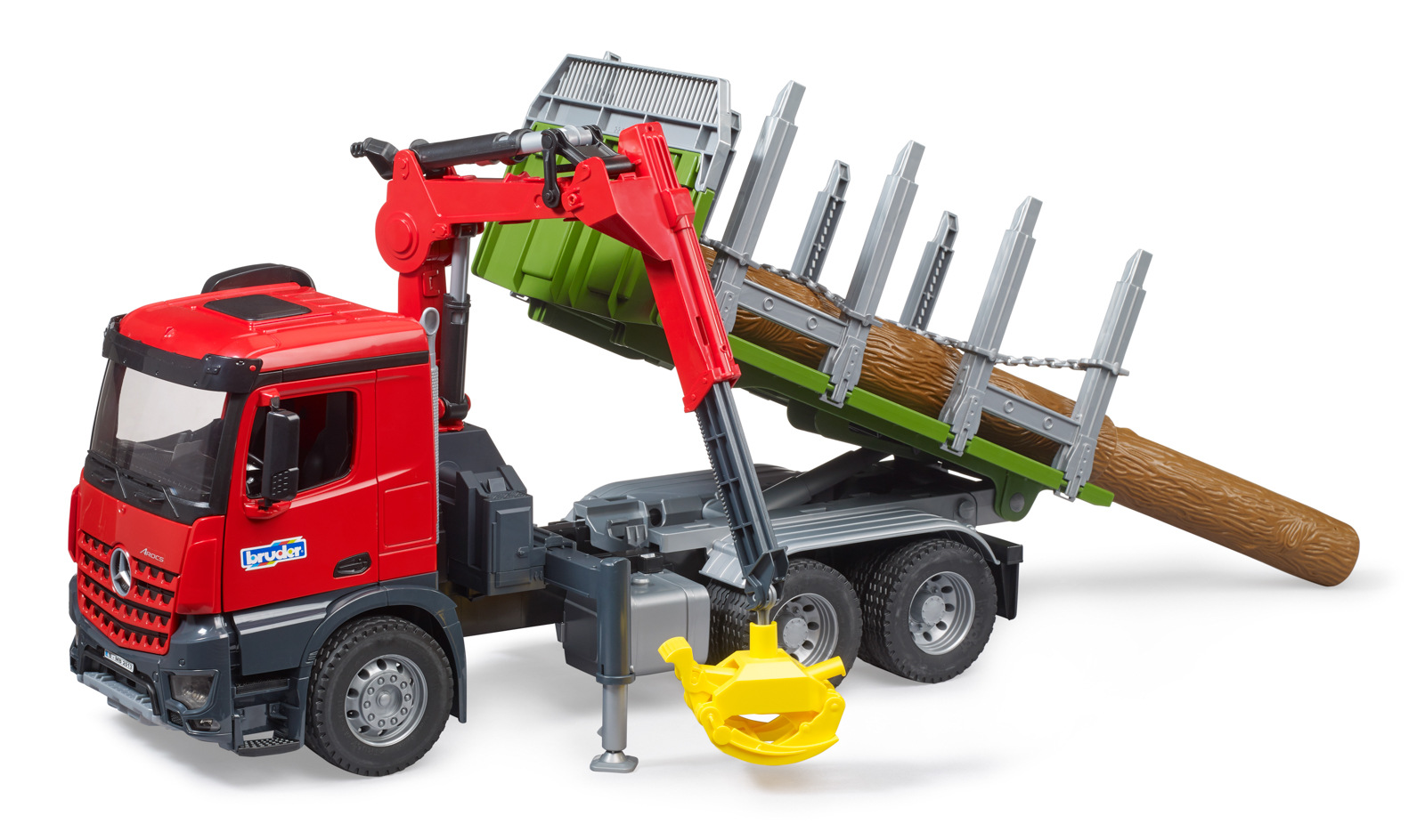 Nový Mercedes-Benz Arocs byl vyvinut tak, aby splňoval technické vlastnosti potřebné pro práci v jakémkoliv terénu. Nakládací jeřáb je vybaven drapákem na dřevo, který slouží k přemisťování klád. Drapák na dřevo lze v otevřené poloze zablokovat. Když je třeba uchopit kládu, spustí se na ni drapák dřeva a po uchopení se drapák automaticky zavře. Pro zajištění nákladu je možné použít vysouvací a spouštěcí podpěry jeřábu a řetězy na sloupcích nakládací plošiny. Sloupky lze samozřejmě také sklopit pro nakládání dřeva do stran. Vzadu lze nákladní automobil vykládat sklopením nakládací plošiny. Kabina má otevírací dveře, takže do vozu může nastoupit jakákoliv figurka z edice Bworld Měřítko: 1:16. Materiál: ABS plast. Rozměry auta: 55 x 18,5 x 28,5 cm. Rozměry balení: 30,5 x 19,5 x 58,5 cm. Věk: 4+