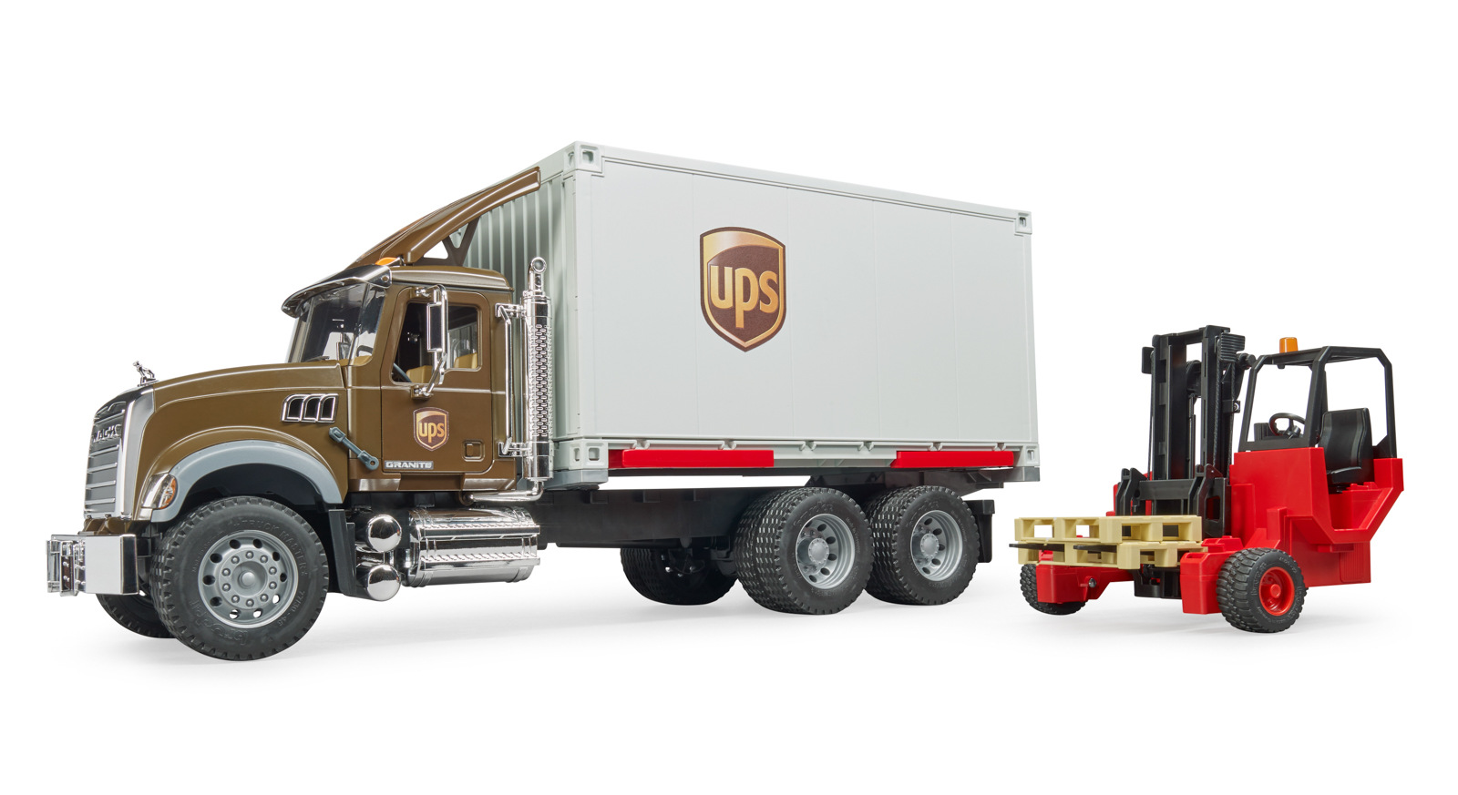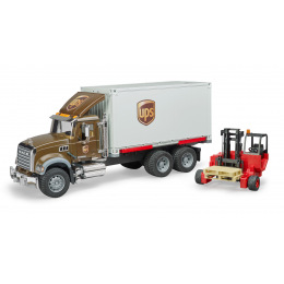 Bruder Komerční vozy - MACK Granite UPS auto s vysokozdvižným vozíkem