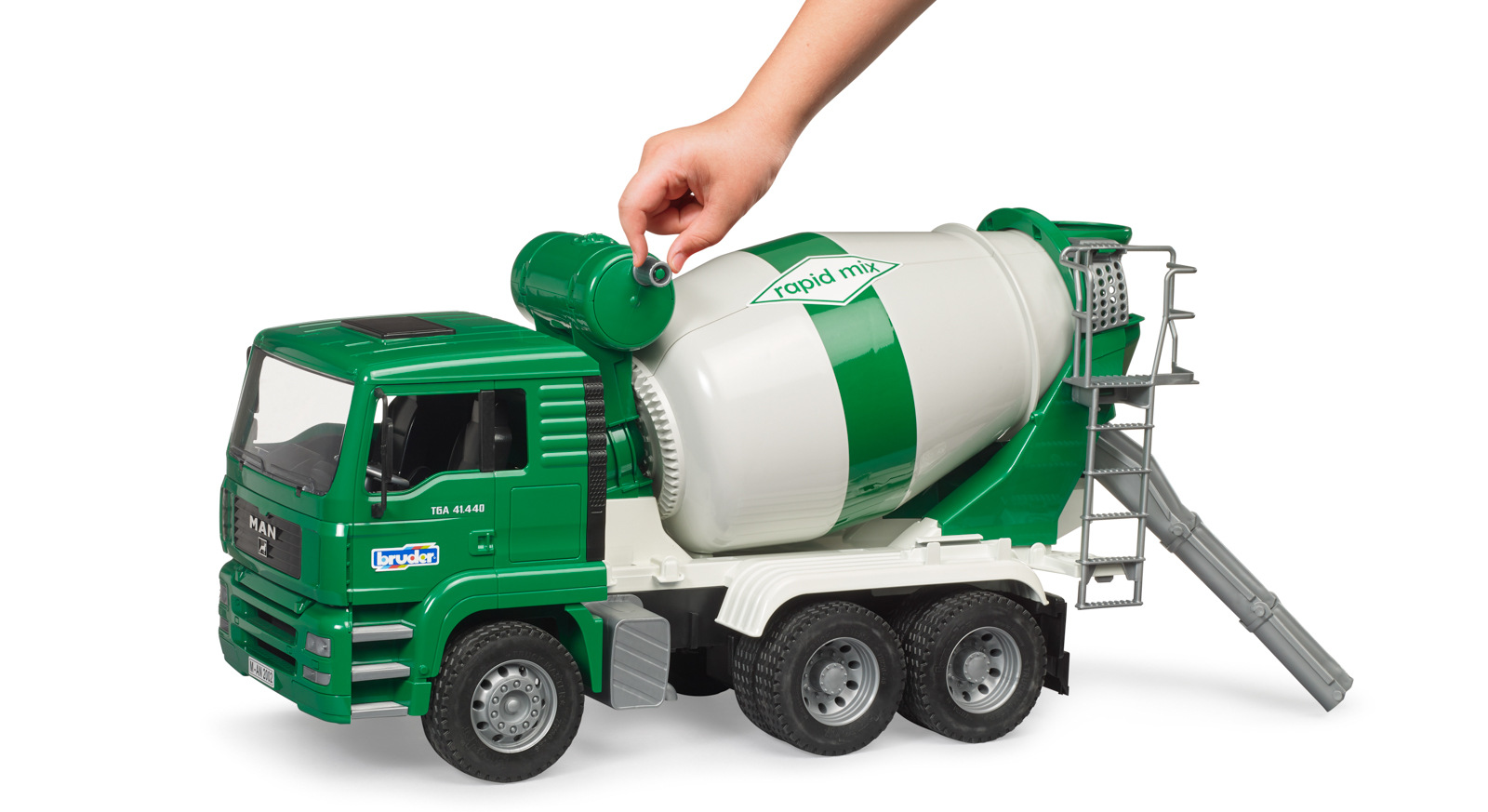 Nová míchačka betonu MAN TGA. Kabina řidiče je sklopná a umožňuje pohled na blok motoru. Buben modernizovaného domíchávače betonu lze otáčet ruční klikou namontovanou v nádrži na vodu. Buben obsahuje míchací šnek a stejně jako originál se buben vyprazdňuje obrácením směru otáčení. Šnek uvnitř bubnu pak dopravuje beton do žlabu. Součástí dodávky jsou dva žlaby k připevnění. Měřítko: 1:16. Materiál: ABS plast. Rozměry auta: 49,2 x 18 x 25,5 cm. Rozměr balení: 28 x 19,5 x 52 cm. Věk: 3+
