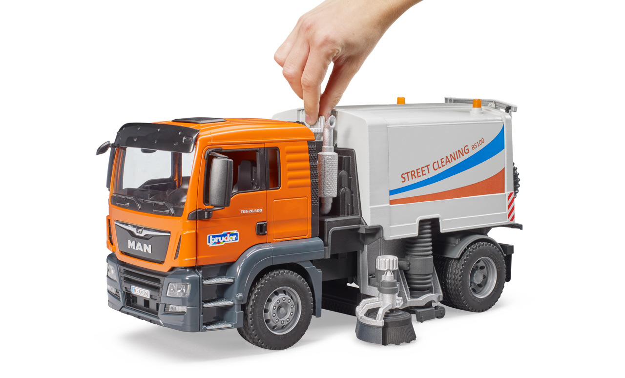 MAN TGS pouliční zametací auto je nepostradatelným pomocníkem pro každé město a je jeho každodenní součástí. MAN TGS pouliční zametací auto od firmy BRUDER je robustně postavené, vybavené výkonným motorem s výkonem až 500 HP. Zametací auto má 2 otočné kartáče, které lze výškově nastavit, a to jim umožňuje dosáhnout na obtížně dostupná místa. Pod vozidlem je instalovaný dlouhý čistící kartáč, který je poháněn za jízdy. Na zadní straně auta je ohebná hadice se sací trubkou, která zachytí mnoho nečistot. Pro vyprázdnění odpadní nádoby auta je možné jednoduše zadní část sklopit. Zadní dveře odpadní nádoby lze otevřít. Kabina řidiče je vyrobena z průhledného a vysoce kvalitního plastu. Vnější zrcátka jsou sklopná, dveře kabiny lze otevřít. Hračka je vhodná pro hru uvnitř i venku. Měřítko: 1:16. Materiál: ABS plast. Rozměry auta: 47 x 19 x 23 cm. Rozměry balení: 27 x 19,5 x 52 cm. Věk: 4+