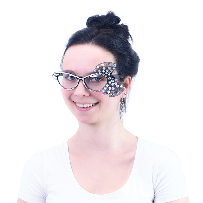 Elegantní karnevalové brýle v černé barvě jsou zdobeny kamínky a mašlí. S tímto doplňkem na očích budete na párty za hvězdu!