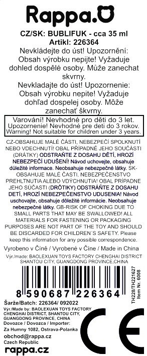 Senzační bublifuk se zvířátkem má obsah 55 ml. Foukátko je součástí víčka. Při pohybu vydává zvířátk