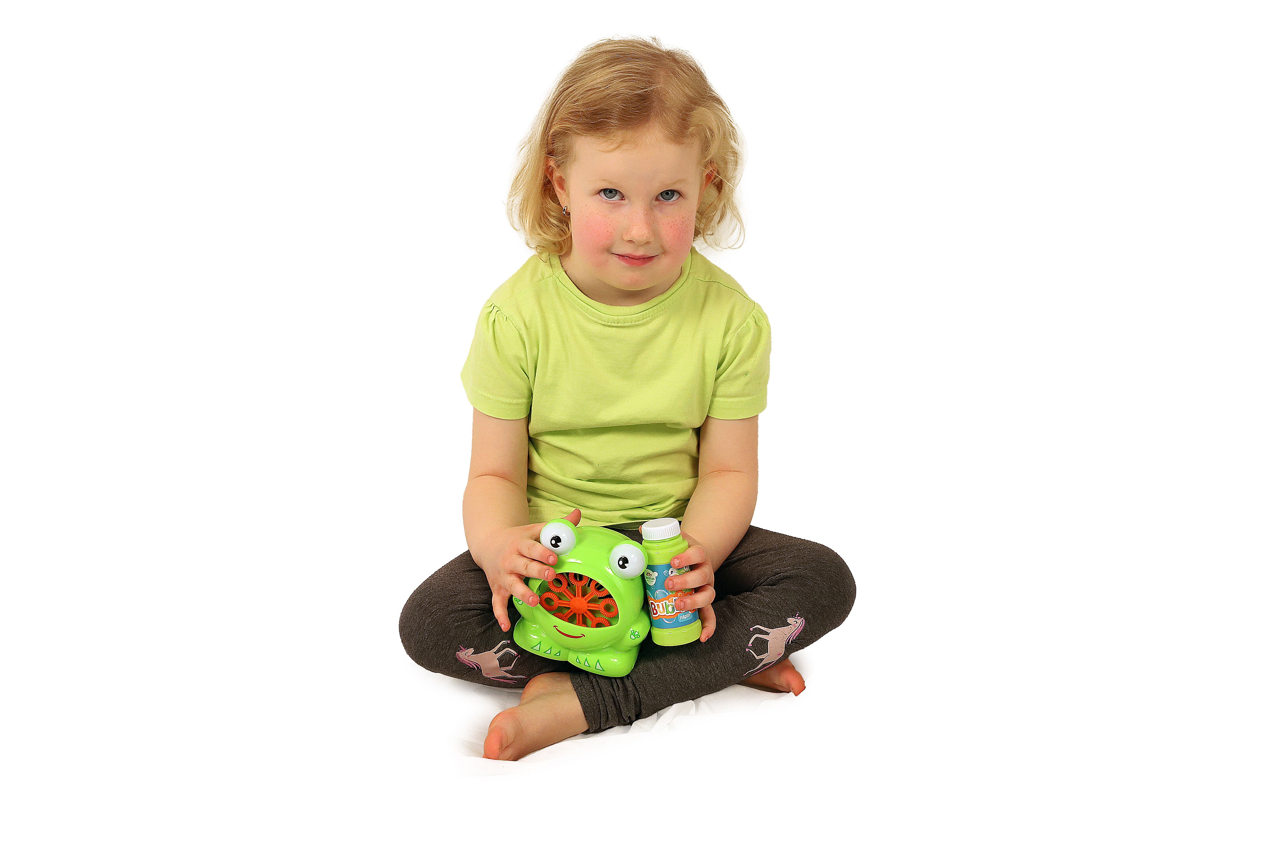 Po zmáčknutí spínače začne žábička chrlit bubliny. Součástí balení je náplň. Baterie 4 x AA nejsou součástí balení. Rozměřy balení 17 x 16 x 12 cm. Vhodné pro děti od 3 let.