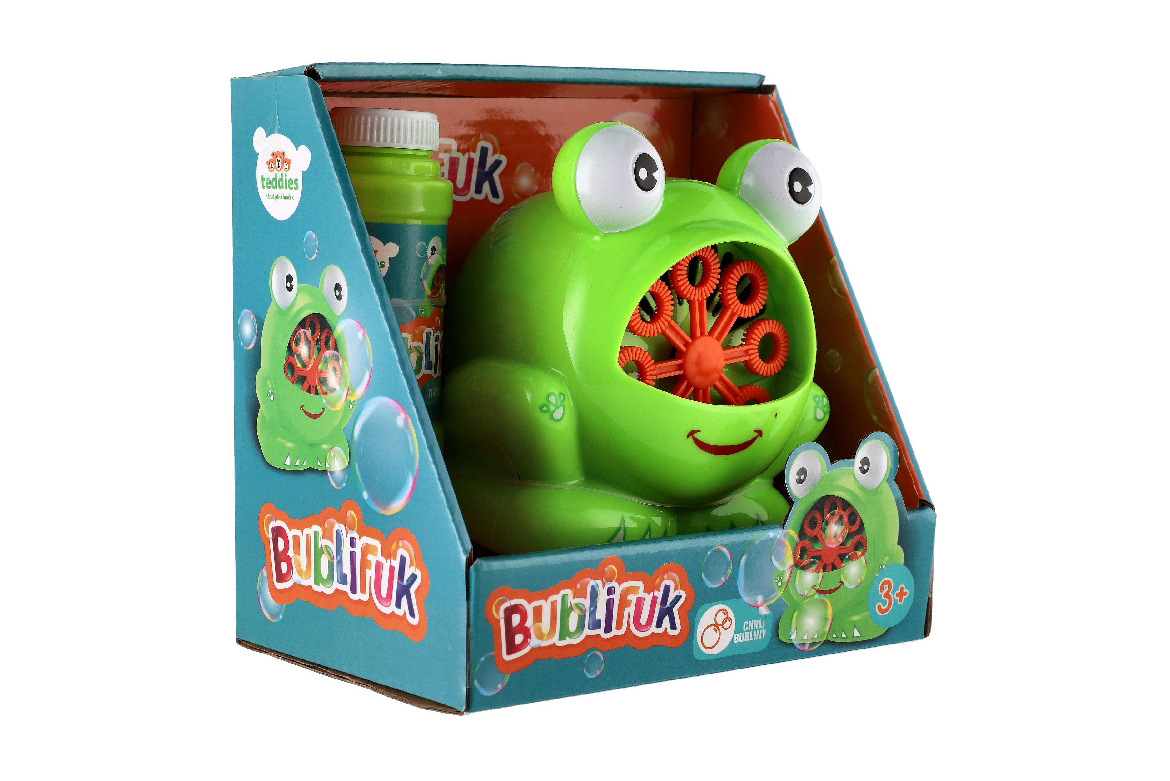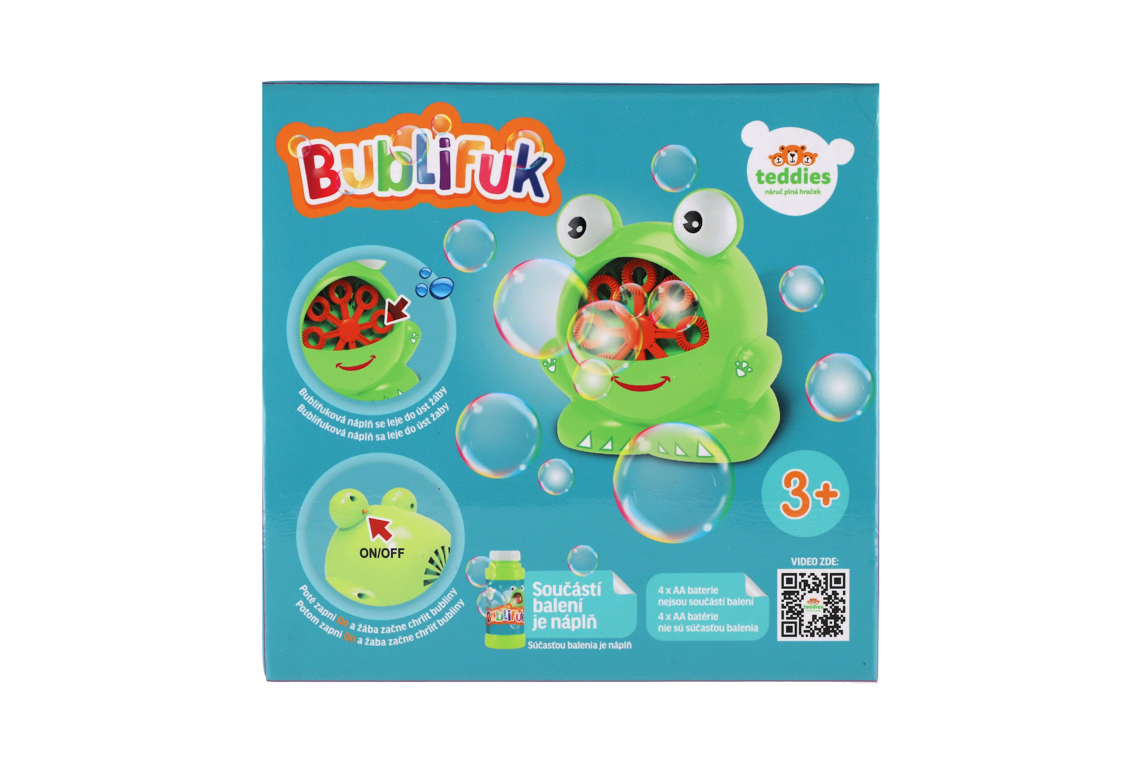 Popis Bublifuk stroj žába plast 11x13cm na baterie + náplň v krabičce 17x16,5x12cm