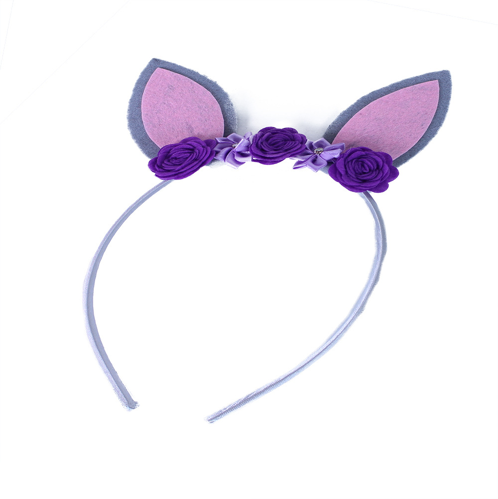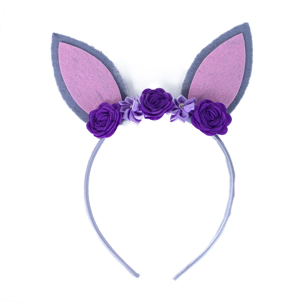 Nepřehlédnutelná karnevalová čelenka s ušima králíčka. Čelenka je ve fialové barvě, zdobená květy a doplněna rúžovo-šedými oušky.