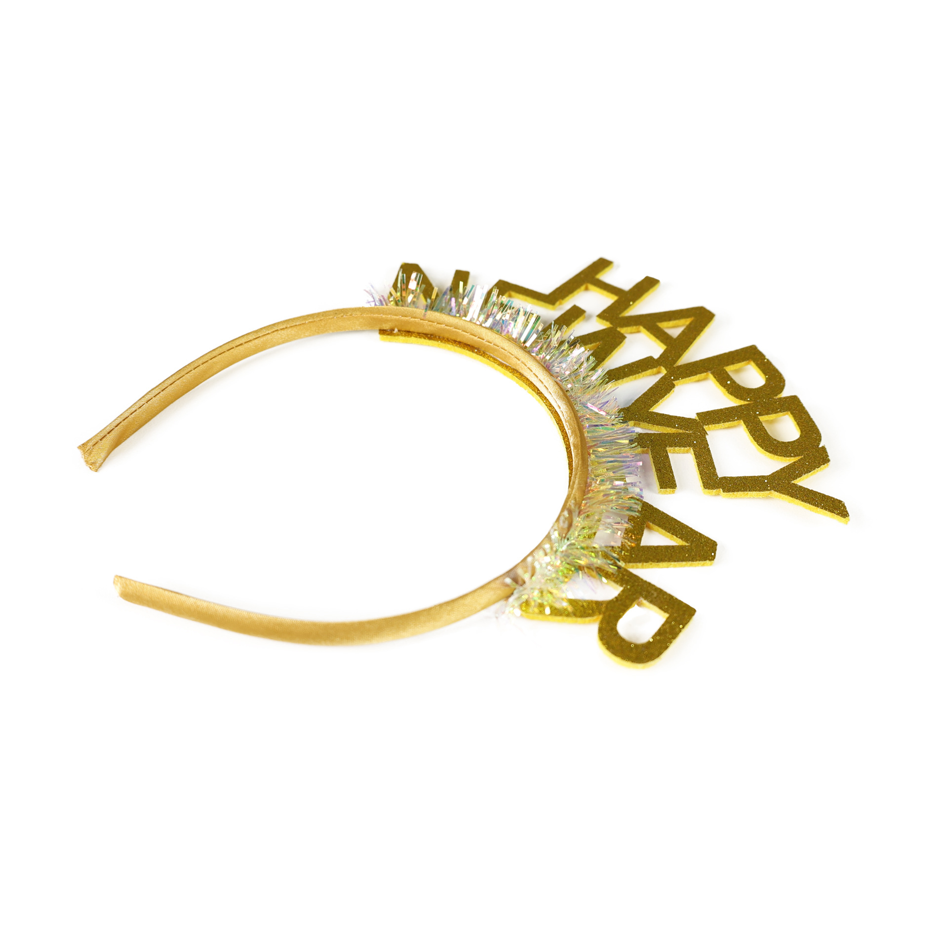 Oslnivá zlatá čelenka s třpytivým nápisem HAPPY NEW YEAR je senzačním doplňkem na oslavu nebo večírek při vítání Nového roku!