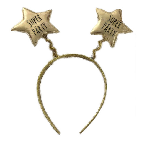 Karnevalová čelenka ve zlaté barvě je zdobená hvězdičkami s nápisem SUPER PÁRTY. Hvězdy jsou k čelence připevněny pomocí pružinek.