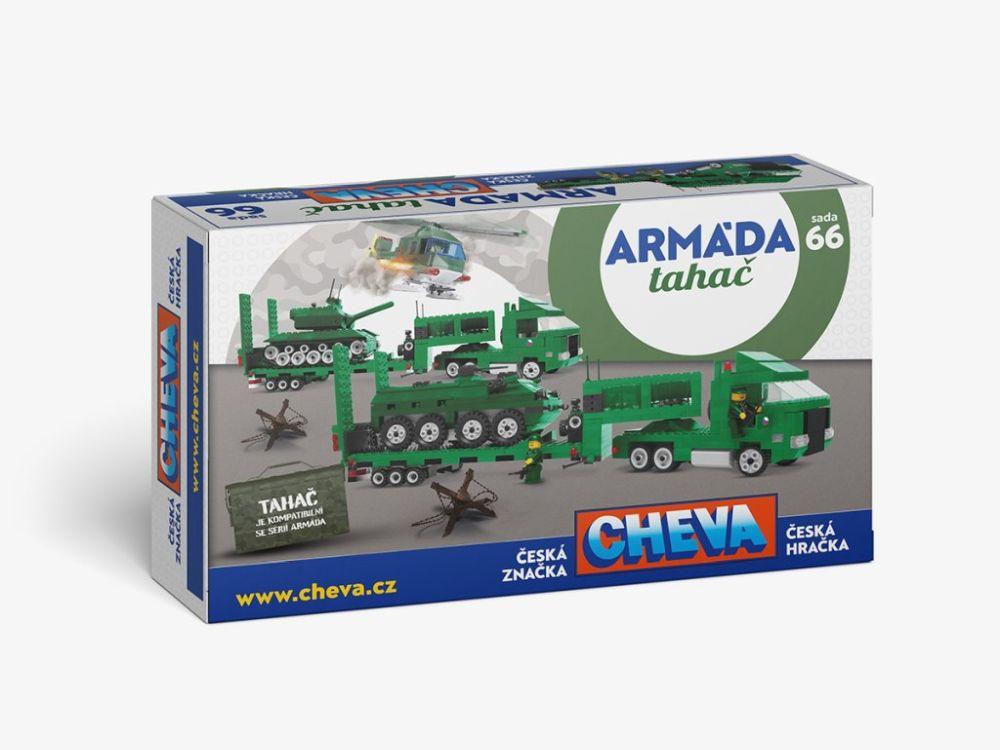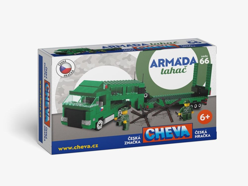 Tato zbrusu nová sada stavebnice Cheva - Tahač je dalším z doplňků k základním verzím stavebnice Cheva. Stavebnice Cheva 66 obsahuje více jak 500 dílků, z nichž lze sestavit Tahač těžké vojenské techniky a přenést se tak do světa válečných bitev.