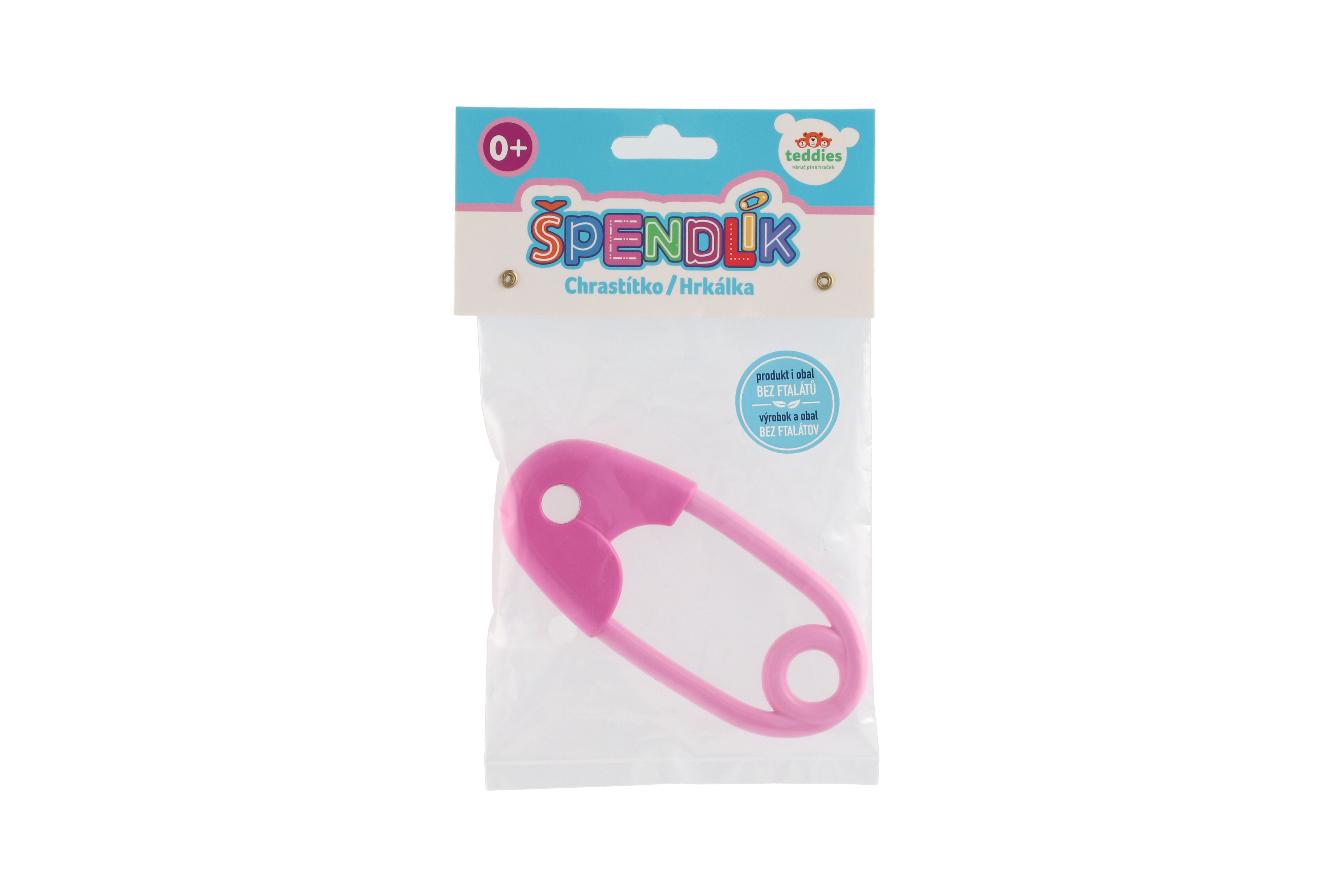 Teddies Chrastítko špendlík plast 12cm růžové 12x19cm v sáčku 0m+
