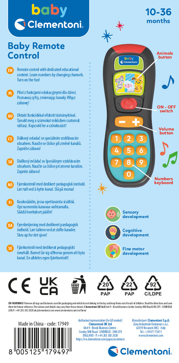 Dětský dálkový ovladač s mnoha elektronickými prvky funkce: měkká pryžová klávesnice s 10 číselné klávesy a 2 tlačítka hlasitosti a tlačítko se světelnými efekty. Rozměr balení: 10x20x4cm. Věk: 10m+
