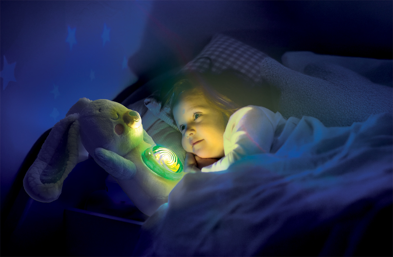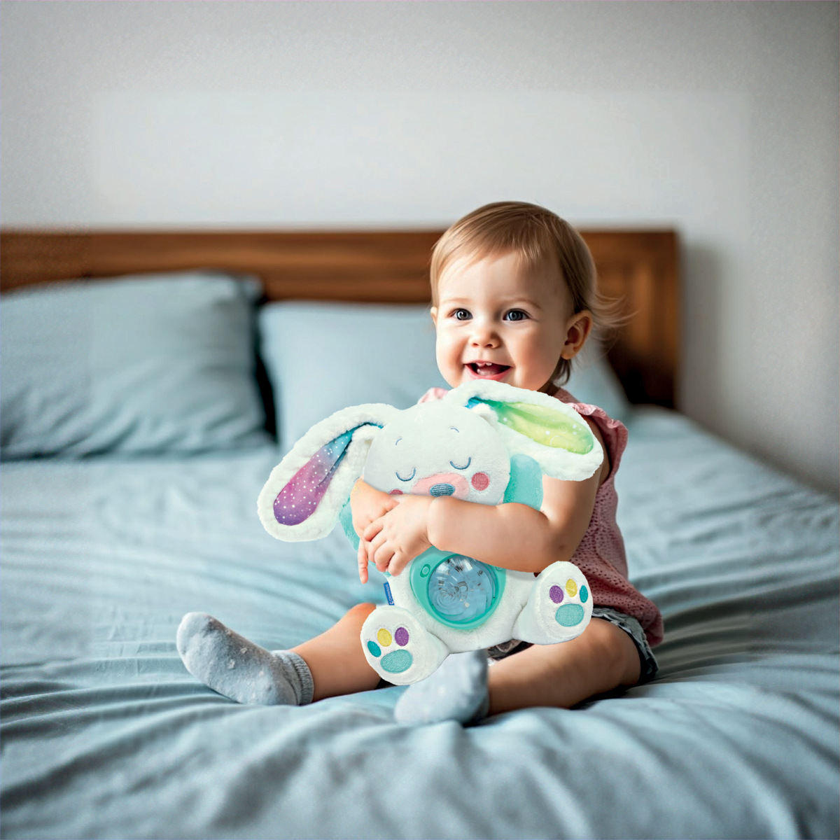 Plyšový arktický králíček od Clementoni Baby vytváří uklidňující atmosféru před spaním tím, že promítá na strop krásnou polární záři. Vestavěný elektronický modul nabízí až 10 různých barev světla, které lze podle potřeby nastavit. Kromě toho roztomilý králíček hraje klasickou hudbu, ukolébavky, přírodní zvuky a bílý šum po dobu až 20 minut. Hlasitost a časovač lze snadno nastavit. Měkoučký plyšový králíček je bezpečným a útulným společníkem pro miminka již od narození. Plyš lze po vyjmutí elektronického modulu vyprat. Baterie: 3 x AAA, jsou součástí. Rozměry balení: 25 x 33 x 17 cm. Věk: 0+