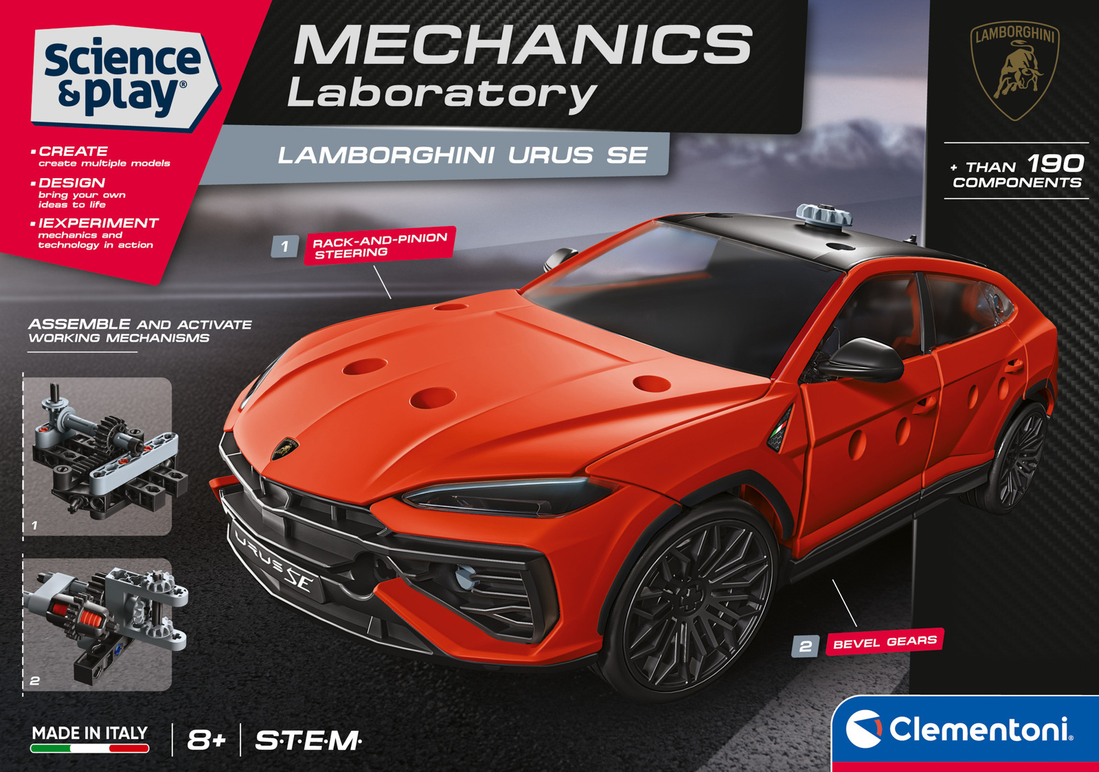 Clementoni Science & Play – Mechanická laboratoř, Lamborghini Urus SE. Objev fascinující svět mechaniky s vědeckou sadou Clementoni Mechanická laboratoř – Lamborghini Urus SE. Tato interaktivní stavebnice vám umožní sestavit realistický model sportovního SUV Lamborghini Urus SE s funkčními mechanickými prvky. Obsahuje více než 190 komponentů k sestavení modelu s propracovanými detaily. Funkční mechanismy modelu: řízení pomocí ozubeného hřebene (rack-and-pinion steering), kuželový převod (bevel gears). STEM hračka – ideální pro rozvoj technického myšlení, kreativity a manuálních dovedností. Zábavný a vzdělávací způsob, jak se seznámit s principy mechaniky a inženýrství. Baleno v krabičce. Rozměry balení: 27,8 x 39,6 x 6 cm. Věk: 8+
