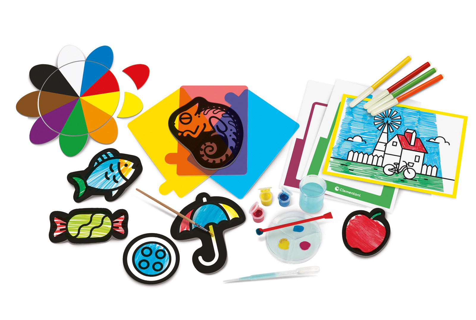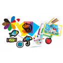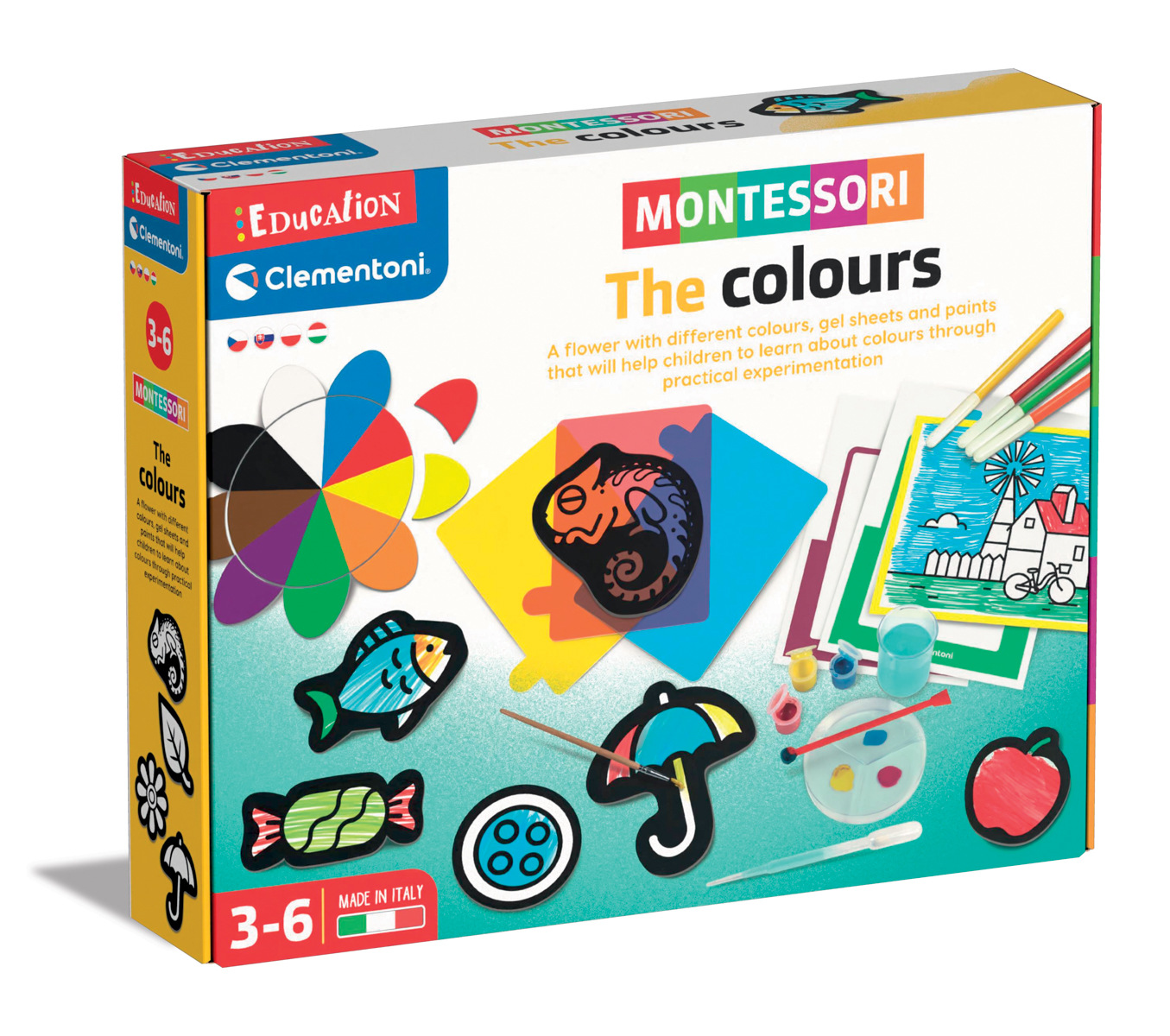 Barevné stohovatelné želé předměty, temperové barvy, štětec, 8 fixů a listy k vybarvení jsou prvky této bohaté sady pro objevování barev pomocí praktických experimentů. Obsahuje také velkou kartonovou květinu pro učení primárních a sekundárních barev pomocí párování. Činnosti jsou postupně obtížnější, protože dítě začíná s květinou zkoumat barvy a učit se jejich názvy, než začne experimentovat s želé, fixy a temperovými barvami. Tato sada inspirovaná metodou Montessori pomáhá dětem přirozeně se naučit typické pojmy předškolního věku, aniž by je nutila. Rozměry balení: 34 x 27 x 6,5 cm. Věk: 3+