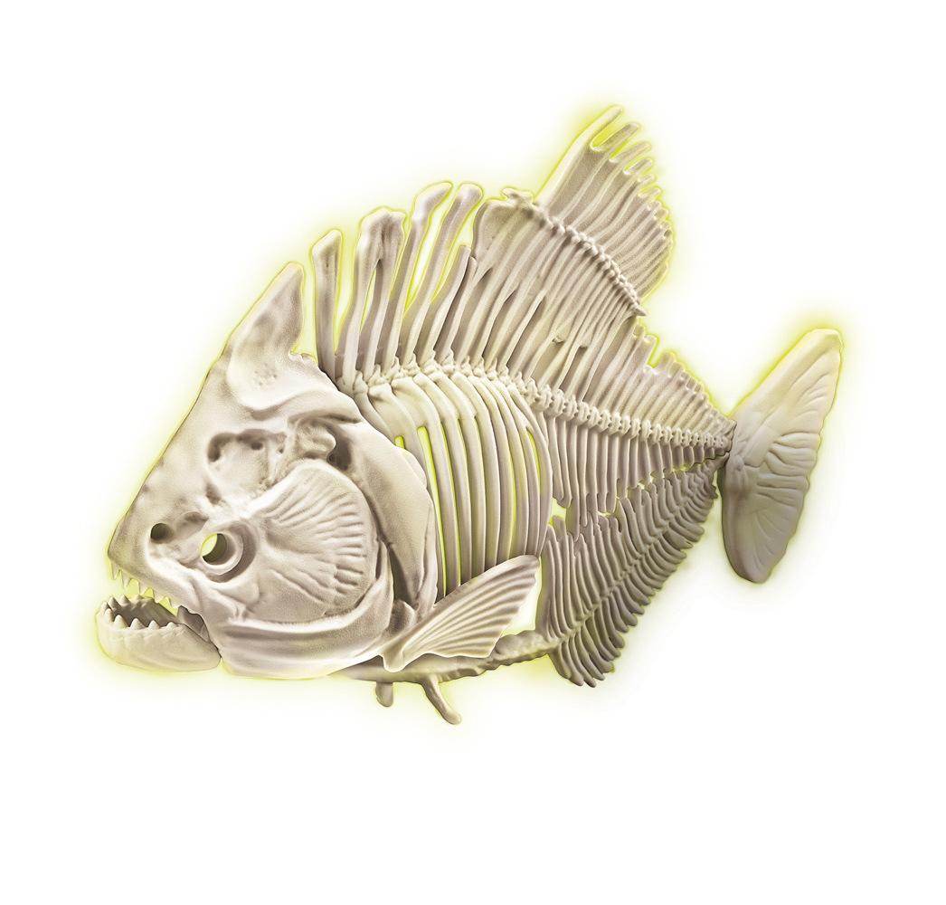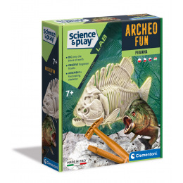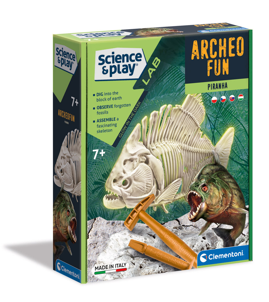 Archeologická sada z kolekce Science & Play LAB dává dětem příležitost stát se paleontologem a prozkoumat kostru dravé ryby – piraně. Pomocí přiložených nástrojů opracujte kámen a objevte kosti, ze kterých si poskládáte svítící kostru piraně. Při objevování postupujte podle návodu. V textu se dočtete více o fosiliích, jejich vzniku a vzniku ryb s kostrou v době paleozoiku nebo kde žijí piraně dnes. Kostra je vyrobena z fluorescenčního materiálu, který ve tmě svítí. Sada pomáhá rozvíjet zručnost, tvořivost, fantazii a podporuje zájem o vědní obory. Sada obsahuje: kladívko, dlátko, blok zeminy s fosilií piraně, ilustrovaný návod v češtině. Jazykové mutace: CZ, SK, PL, HU. Rozměry balení: 25,2 x 21 x 6,5 cm. Věk: 7+