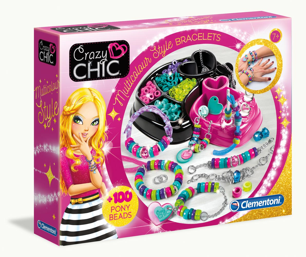 Crazy CHIC – exkluzivní kreativní set pro vytváření barevných trendy náramků. Sada obsahuje 100 barevných plastových korálků, lycra třpytivé pásky a řetízky k vytvoření okouzlujících náramků. Vytvářejte šperky s vícebarevnými efekty. Rozměr balení: 29 x 30,8 x 6 cm. Věk: 7+