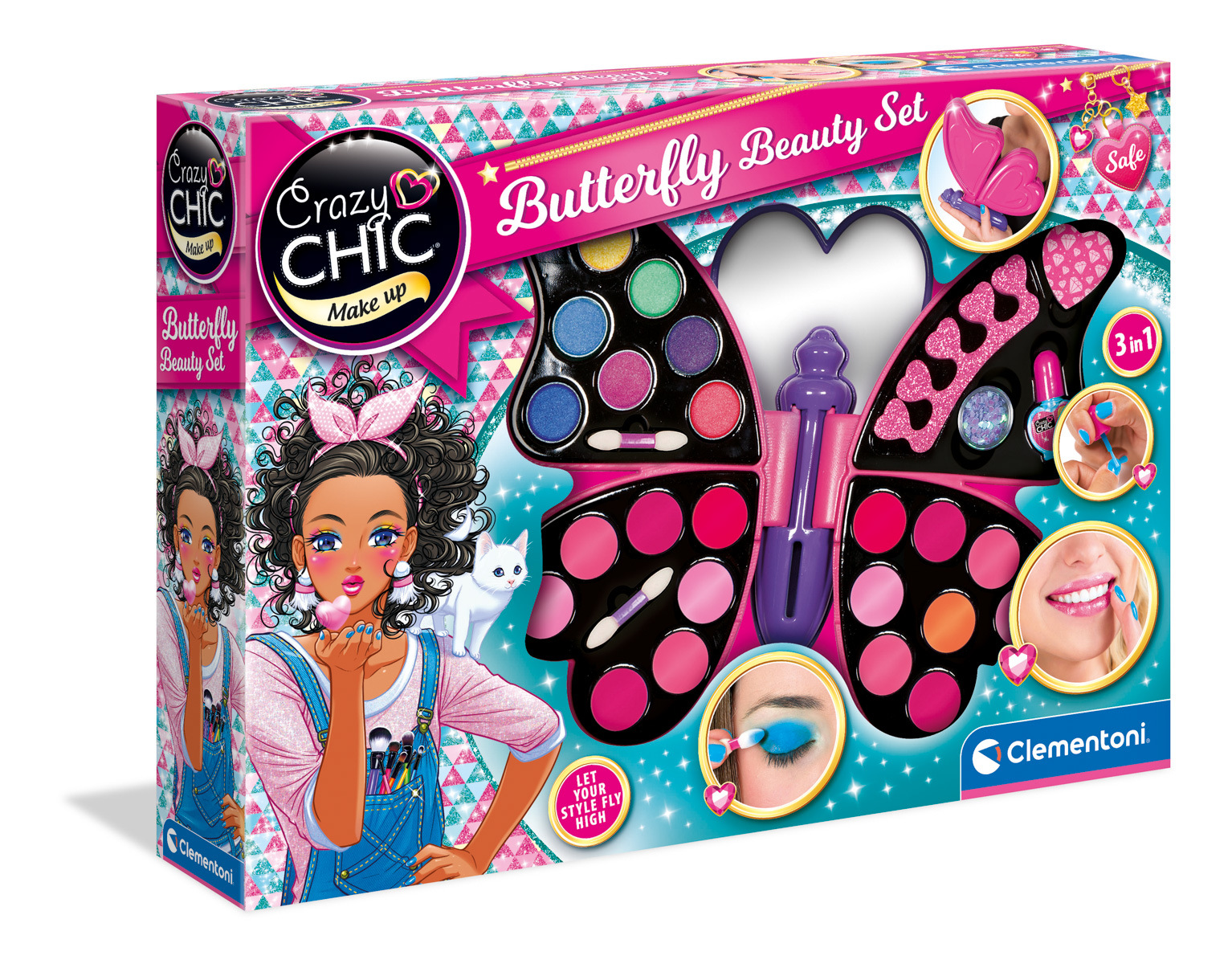 Fantastická sada Make-upu 3 v 1 ve tvaru motýlka obsahuje vše potřebné pro perfektní vzhled v bláznivém stylu Crazy Chic. Vše, co bude malá slečna pro líčení a manikúru potřebovat: sypké oční stíny se třpytkami, sypké oční stíny, třpytivý lesk na rty, lesk na rty, barevné třpytky, lak na nehty a další příslušenství, sklopné zrcadlo, ilustrovaný návod. Rozměry otevřené kazety: 27 x 34 x 3 cm. Rozměry balení: 34,5 x 47,9 x 9 cm. Věk: 6+