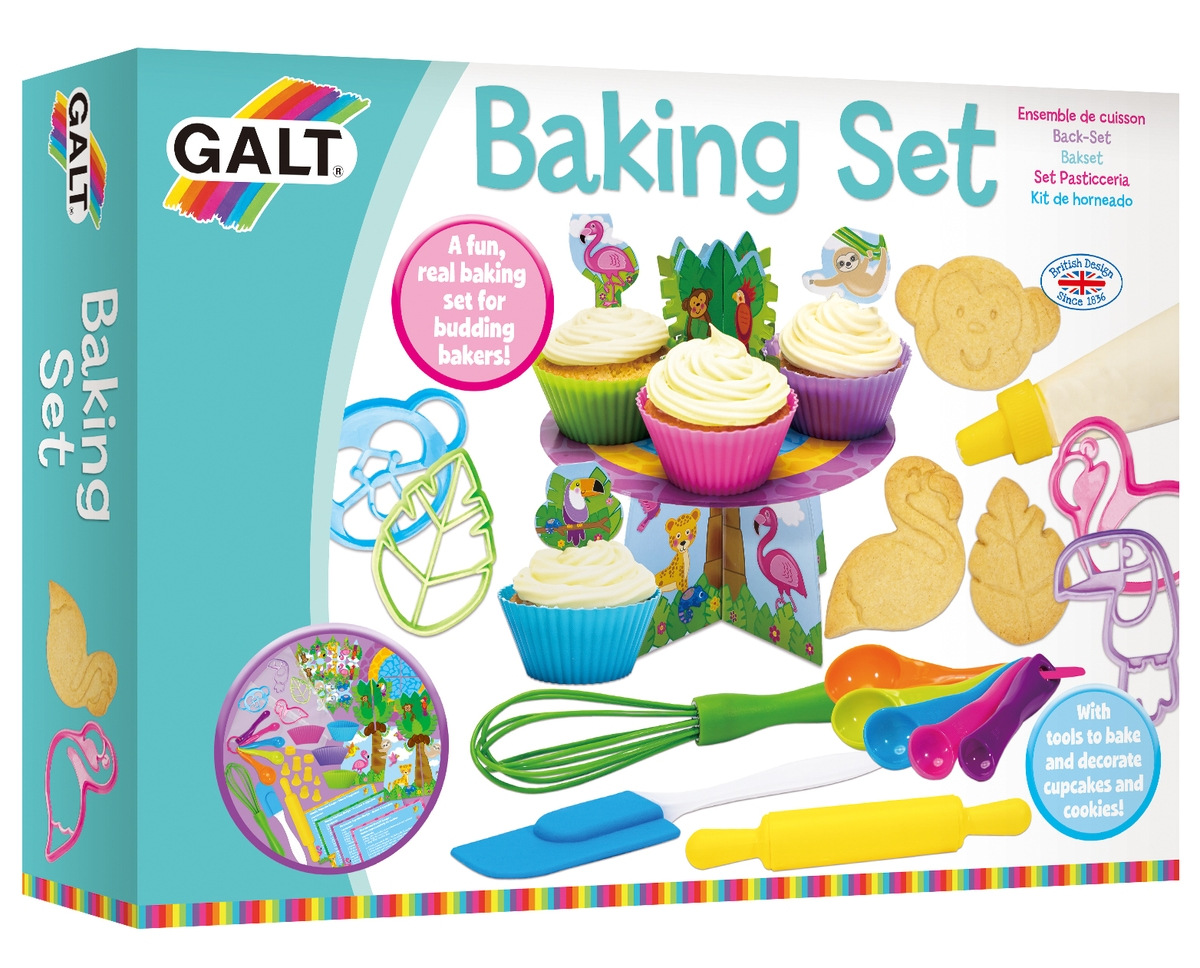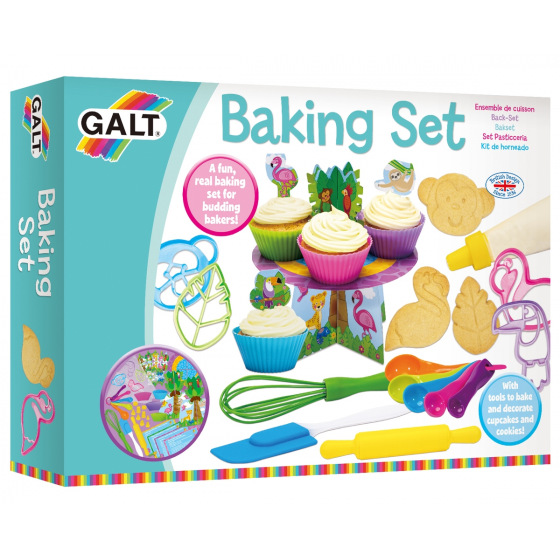 Zábavná sada pro opravdové pečení obsahující náčiní v zářivých barvách. Můžeš péct dortíky a sušenky, zdobit je pomocí zdobicí sady na polevu a vystavit je na podnosu. Sada obsahuje čtyři karty s jednoduchými recepty na vanilkové a čokoládové dortíky, sušenky a vanilkovou polevu.