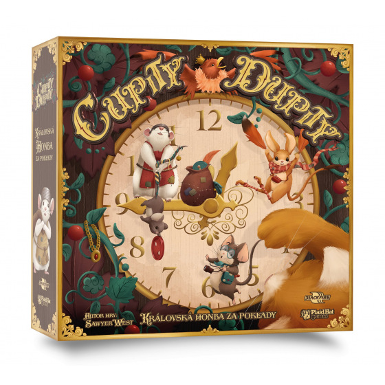 Obsah balení: 1 deska hodin 1 sada hodinových ručiček 2 záslepky na ručičky 3 postranní desky 4 desky honby 1 sáček 93 akrylových destiček 12 žetonů akčních polí 16 karet myšek 20 dřevěných figurek 25 mini karet 1 desetistěnná kostka 18 žetonů a ukazatelů 2 referenční destičky pravidla hry