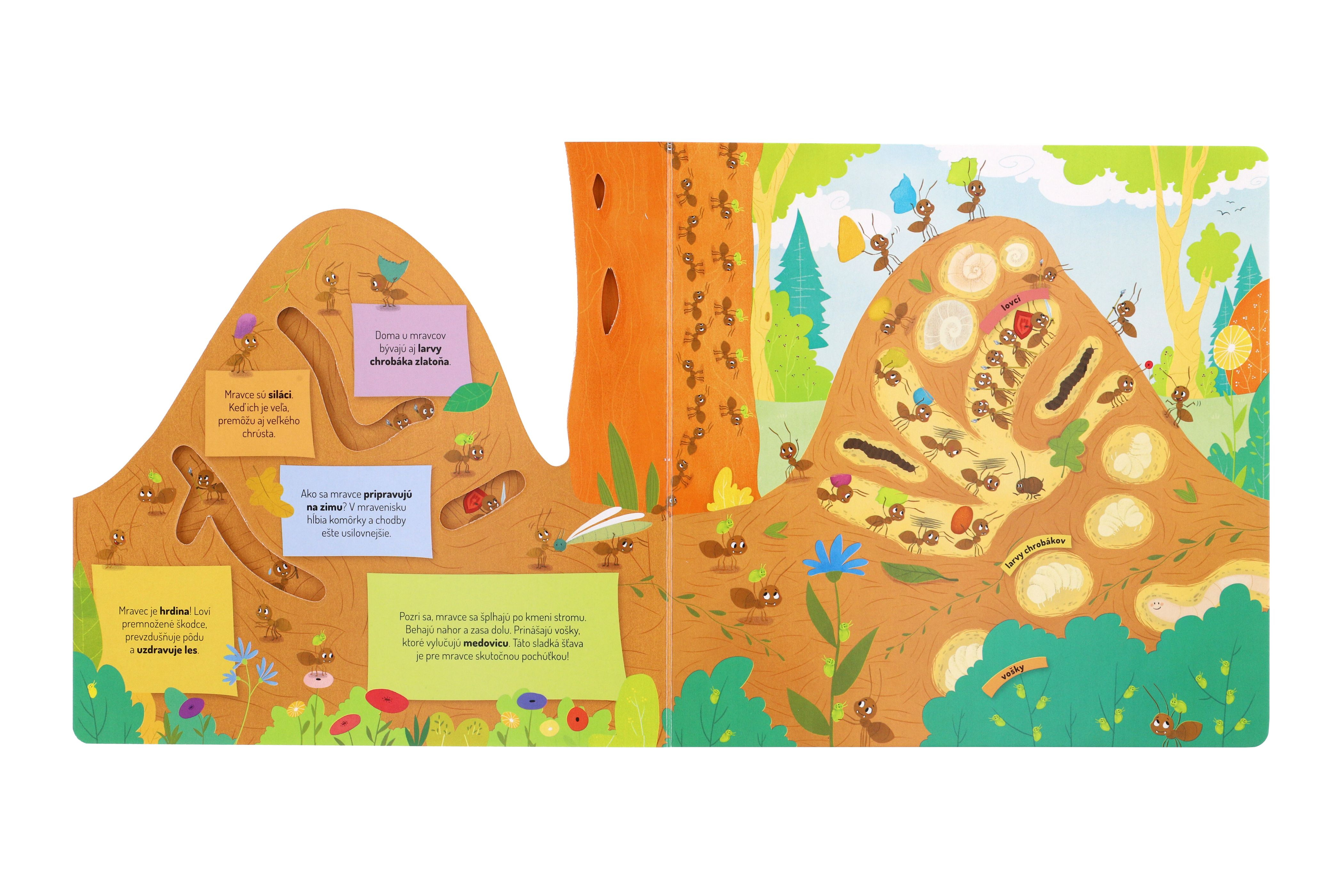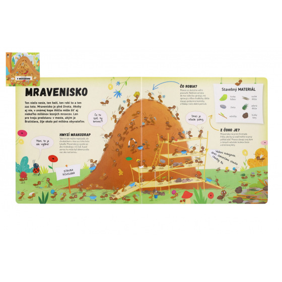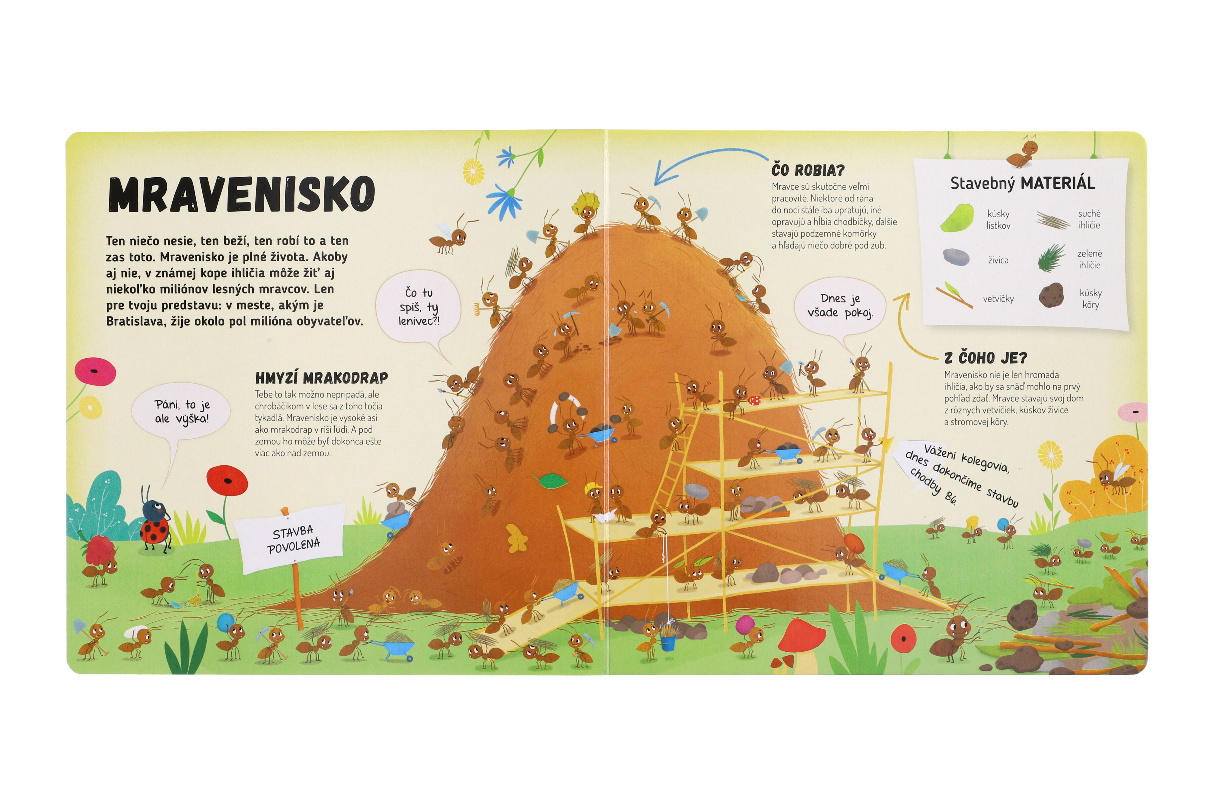 Predstav si, že si mravec a stráviš jeden deň v mravenisku. Aké to asi bude? Celý deň sa budeš stále niekam ponáhľať – upratovať a hĺbiť chodbičky, hľadať rôzne semienka, aby si mal čo jesť, a keď ťa to prestane baviť, vylezieš úplne hore na vrch mravčej kopy, aby si sa opaľoval a nahrieval si telíčko. Ale dosť už bolo rečí. Vieš čo? Urob si pohodlie a poď sa s nami pozrieť priamo do mraveniska... Rozmer: 23 x 23 cm Vhodné od 3 rokov