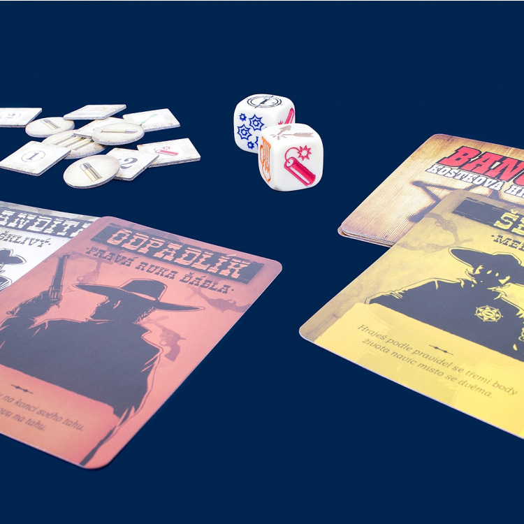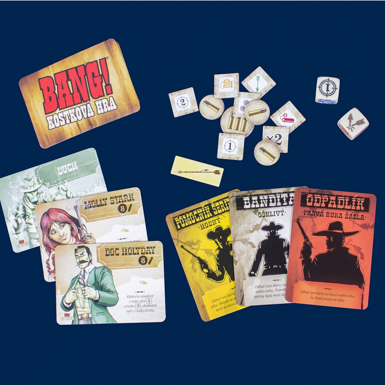 . Dem Spiel werden sofort fünf Module hinzugefügt, die Sie miteinander kombinieren können, um mit ihrer Hilfe das Würfelspiel Bang! zu bereichern.Zum Spielen ist es notwendig, das Grundspiel Würfelspiel Bang!. Der Spielverlauf ähnelt der Grundvariante des Würfelspiels Bang!, aber mit einigen Variationen, bei denen neue Würfel, spezielle Rollen und neue Charaktere ins Spiel kommen.