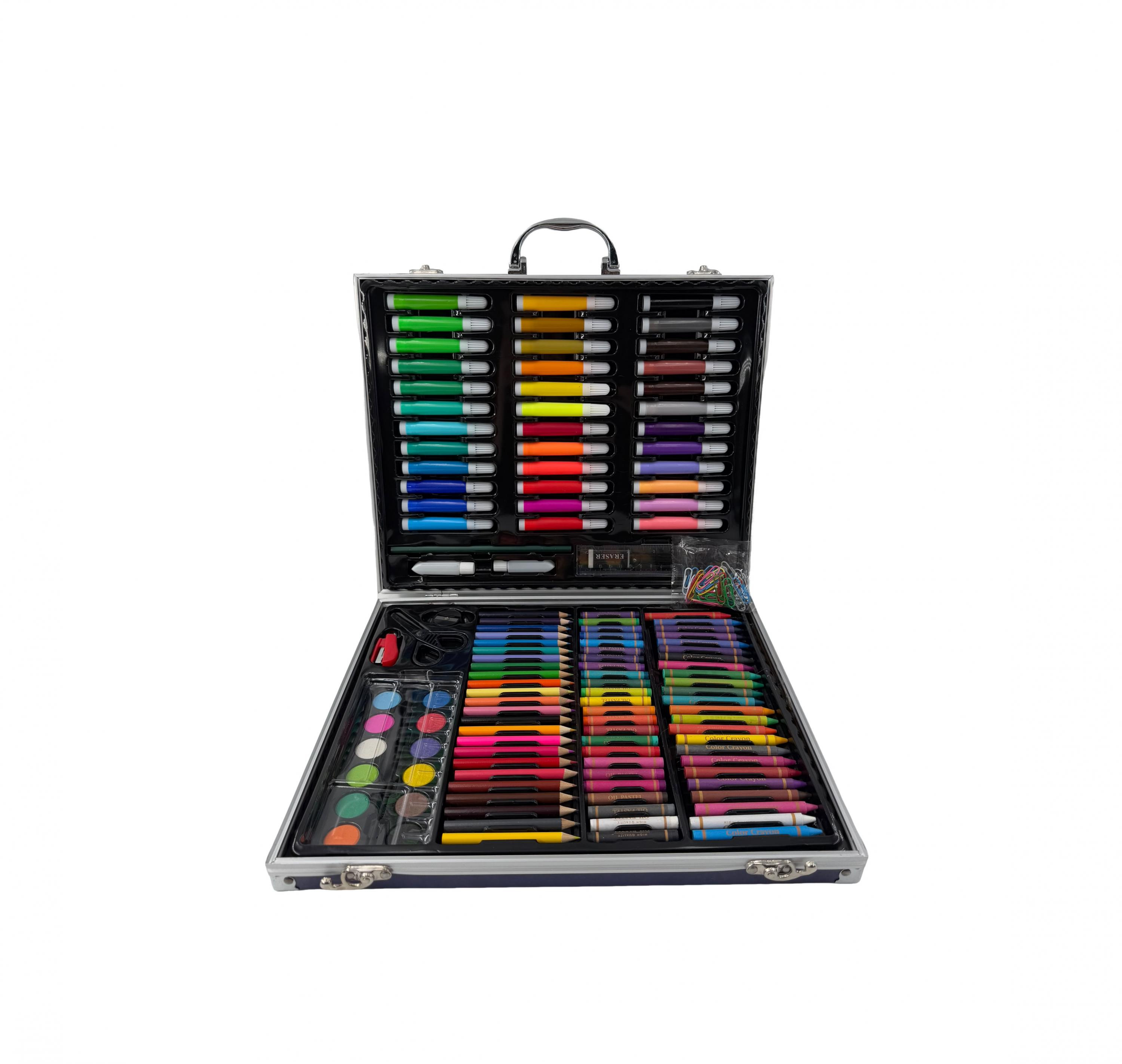 Pastelky: Sada barevných pastelek, které hladce kloužou po papíře a umožní ti vykreslit i ty nejjemnější detaily tvých vesmírných scén. Fixy: Jasné a syté fixy pro výrazné linky a vyplňování větších ploch. Voskovek: Hladké voskovky s bohatou pigmentací, ideální pro nanášení vrstev a vytváření zajímavých textur. Můžeš s nimi malovat mlhoviny nebo povrchy vzdálených planet. Vodovky: Paleta vodových barev s pestrou škálou odstínů. S trochou vody a štětce můžeš vytvářet průsvitné lazury a prolínající se barvy, které dodají tvým dílům éterický vzhled. Nůžky: Bezpečné nůžky s kulatou špičkou, které pomohou s vystřihováním tvarů a vytvářením koláží. Ořezávátko: Praktické ořezávátko, aby tvé pastelky a voskovky byly vždy perfektně ostré pro přesnou práci. Pravítko: Pravítko pro přesné měření a rýsování rovných linií, ať už kreslíš kosmické lodě nebo orámuješ svá díla. Další pomůcky a malé drobnosti pro tvoření. V kufříku můžeš najít i další užitečné drobnosti.