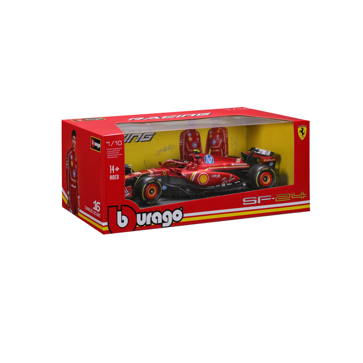 Bburago modely závodních vozů Formule 1 v měřítku 1:18 z kolekce FORMULA RACING jsou sbírkou krásného designu s vysokým důrazem na přesnost detailů včetně helmy jezdce. Modely F1 ze stáje Ferrari SF-24 (2024) jsou vyrobeny z litého kovu s plastovými detaily. Každý z modelů je v klasickém závodním designu a se závodním číslem. Baleno v krabičce. Nevhodné pro děti do 3 let. Rozměry balení: 13,8 x 35 x 18,5 cm. Věk: 14+