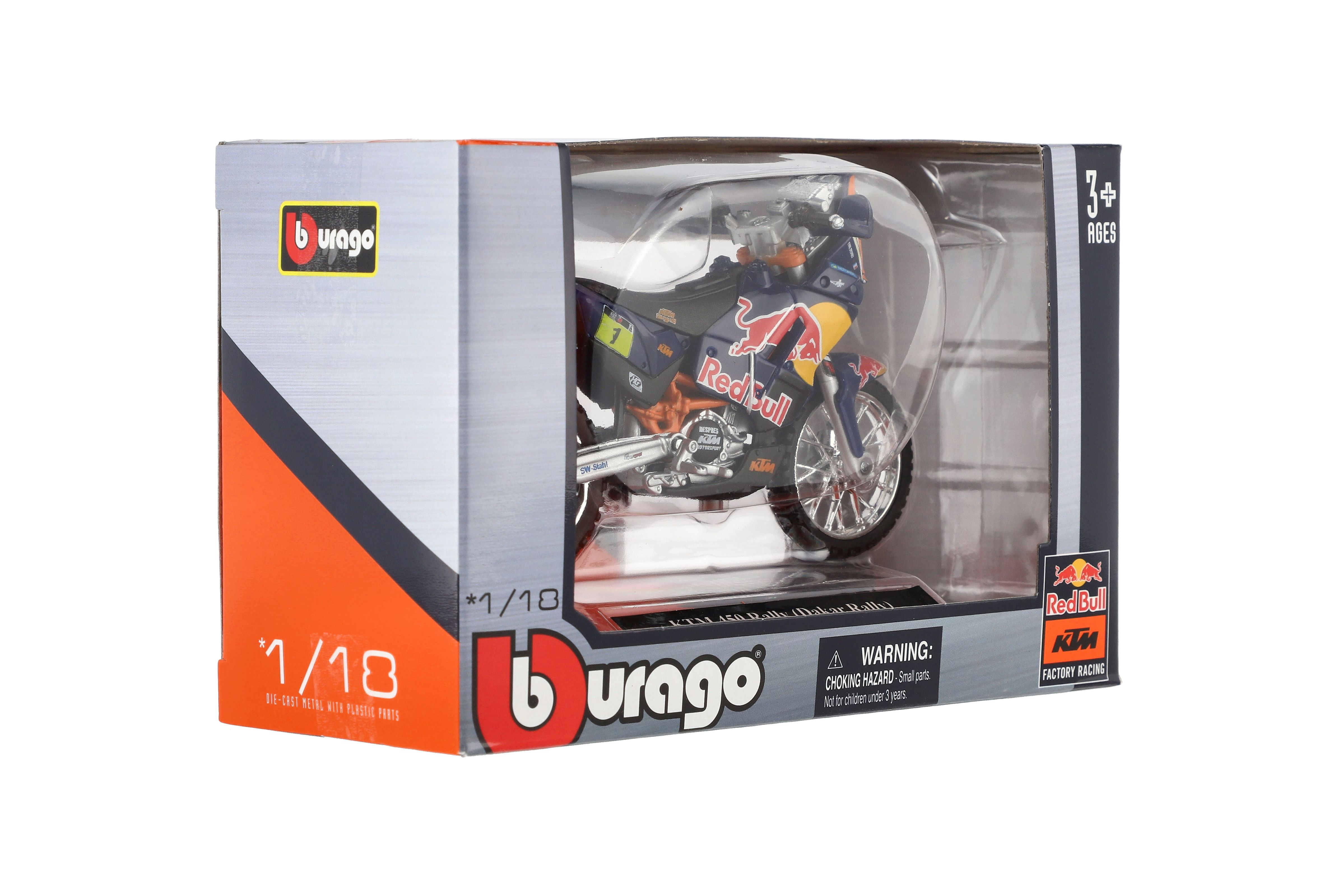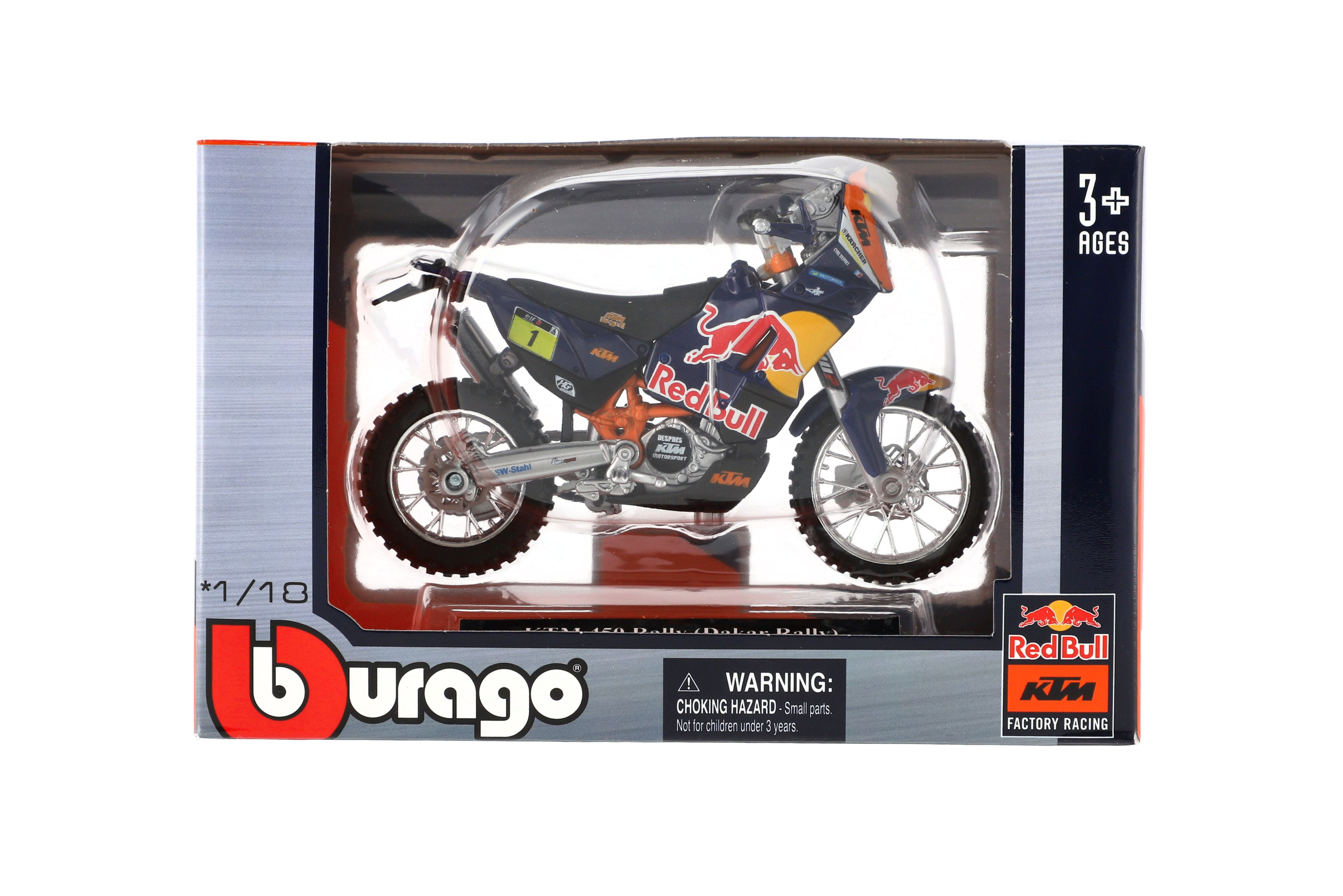 Bburago KTM 450 Rally (Rallye Dakar) Motorrad für alle Motorradliebhaber. Dieses Modell wird alle kleinen Sammler begeistern. Im Maßstab 1:18. Motorradgröße: 12 cm Verpackungsmaße 17 x 11 x 7 cm Geeignet für Kinder ab 3 Jahren