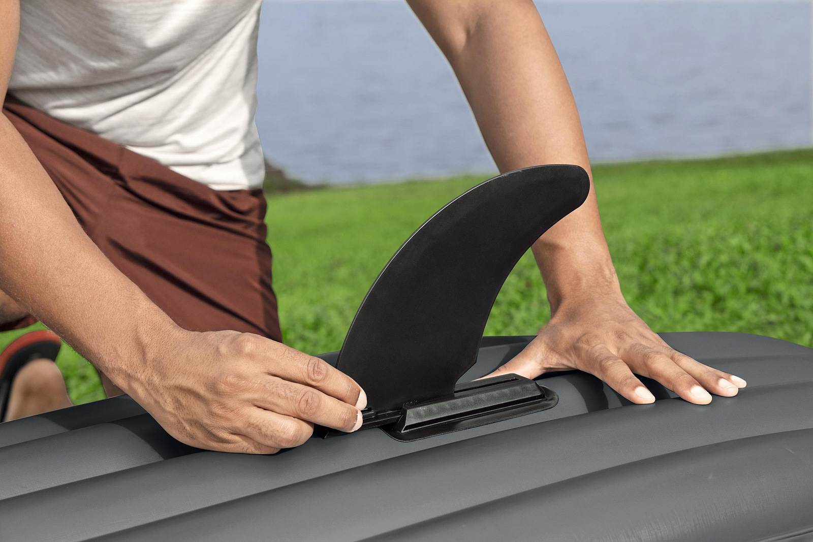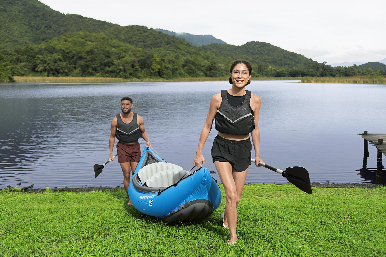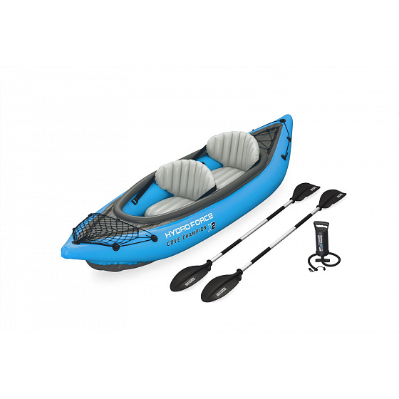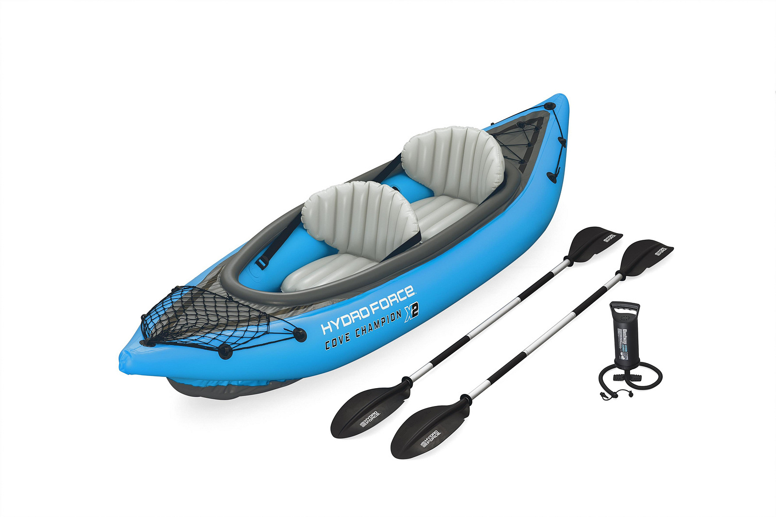 Aufblasbares Kajak für zwei Personen Hydro-Force™ Cove Champion X2. Heben Sie Ihren Sommer auf die nächste Stufe und lassen Sie sich auf dem See, Fluss oder Meer im aufblasbaren Kajak Hydro-Force™ Cove Champion X2 treiben. Dieses Kajak-Set für zwei Personen enthält alles, was Sie für einen großartigen Tag auf dem Wasser benötigen - 2 Paddel, eine Pumpe und ein Reparaturpflaster. Dieses leichte Kajak-Set ist für eine schnelle und einfache Montage konzipiert. Das Kajak lässt sich leicht mit der mitgelieferten Air Hammer™ Handpumpe aufpumpen. Ein komfortables, großes Cockpit enthält zwei aufblasbare Sitze mit Rückenlehnen für zusätzlichen Halt. Dieses Kajak bietet auch viel Stauraum für Snacks, zusätzliche Ausrüstung oder andere Wasserbedarfsartikel. Es gleitet leicht über das Wasser mit Hilfe von Flossen am Boden, die abnehmbar sind, um eine einfache und kompakte Lagerung zu gewährleisten. Der Transport oder das Verankern dieses Kajaks ist mit dem umwickelten Seil ein Kinderspiel. Einfache Handhabung und einfache Lagerung. Maß: 3,31 m x 88 cm. Ideale Größe für bis zu 2 Erwachsene. Tragfähigkeit: 180 kg. Fester und starrer aufblasbarer Boden. Abnehmbare Flossen für Richtungsstabilität und einfache Lagerung. Bequemer Cockpit mit 2 aufblasbaren Sitzen und Rückenlehnen.