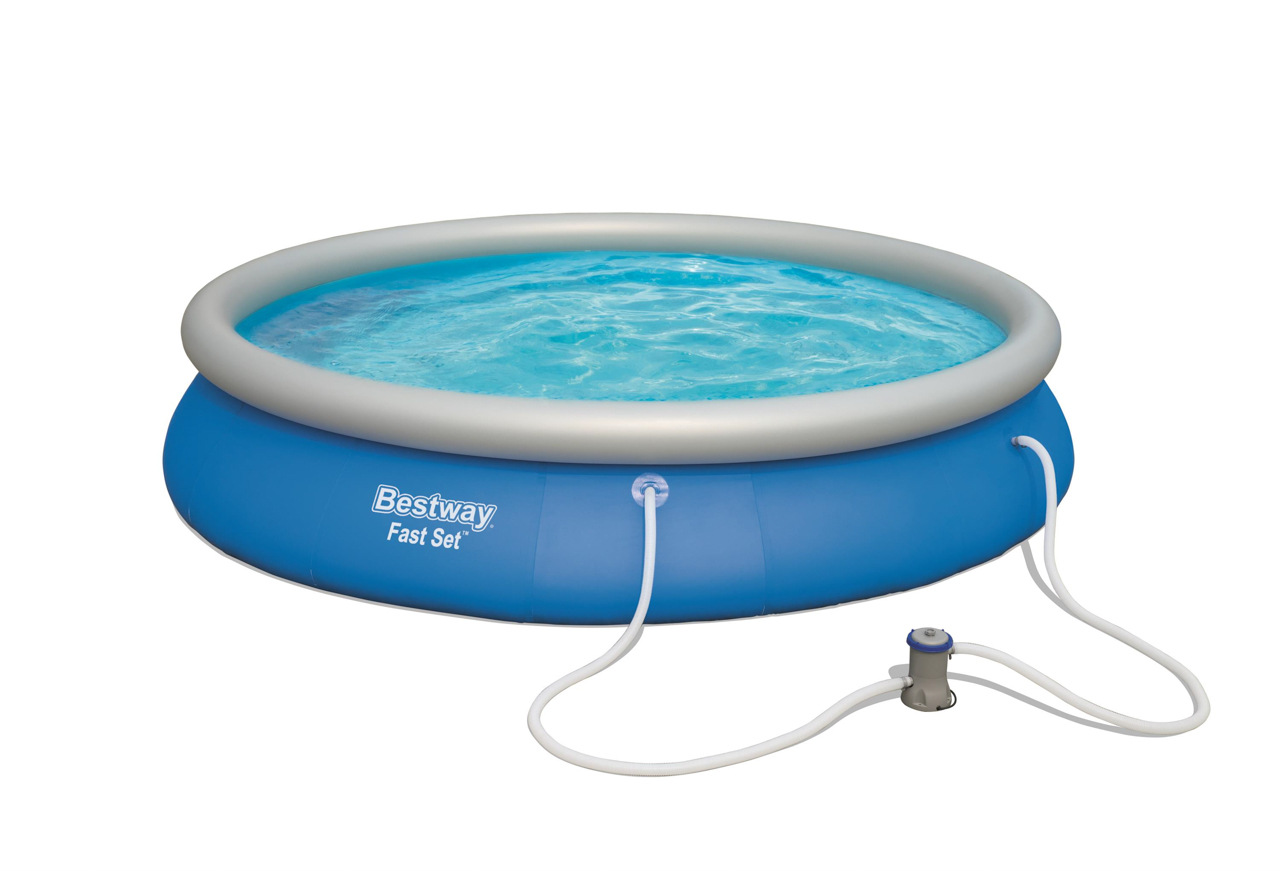 Der Bestway Fast Set runde Aufstellpool ist ein großartiger Familienpool, den Sie in wenigen Minuten aufbauen können. Es reicht eine ebene Fläche, den oberen Ring aufzupumpen. Der Poolkörper hebt sich, sobald Sie den Pool mit Wasser füllen. Das Set enthält eine Filterpumpe und eine Filterkartusche, die das Wasser frisch und sauber hält. Es wird auch mit einem Ablassventil zur Durchflussregelung geliefert, das eine schnelle Entleerung am Ende der Saison ermöglicht. Die extra starken Seitenwände dieses Pools sind aus Tritech™-Material gefertigt, einem 3-lagigen verstärkten Material mit einem Kern aus Polyestergewebe, das zwischen zwei Schichten hochdichtem PVC-Material eingeschlossen ist. Dies ergibt eine Gesamtdicke von 0,40-0,80 mm (Größe 16-32) je nach Poolgröße und bietet hervorragende Festigkeit und Haltbarkeit, sodass Sie den Pool auch in den kommenden Jahren nutzen können. Attraktiver Rattan-Druck an der Außenwand des Pools. Maß: 457 x 84 cm. Verpackungsmaße: 44,5 x 75 x 27 cm. Verpackungsgewicht: 23,25 kg. Wasserkapazität: 9.677 l. Enthält: 1 Pool, 1 Filterpumpe (220-240 V) mit kompatibler Kartusche, 1 Unterwasser-Reparaturflicken.