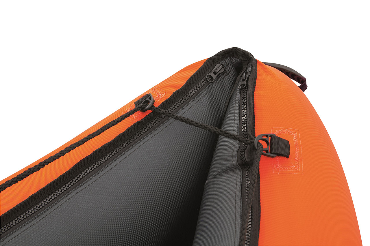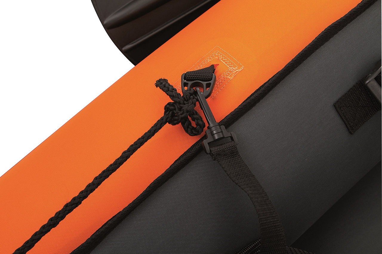 Dva odnímatelné boční panely; Základna s robustní konstrukcí I-beam, vysoce kvalitním potaženým nylonovým pouzdrem, odolným vůči UV záření, slané vodě a oleji; 2 nastavitelná sedadla s úložným prostorem, odnímatelným úložným pouzdrem, vestavěným odvodňovacím ventilem, obvodovou vazbou s vestavěnými průchodkami kabelů