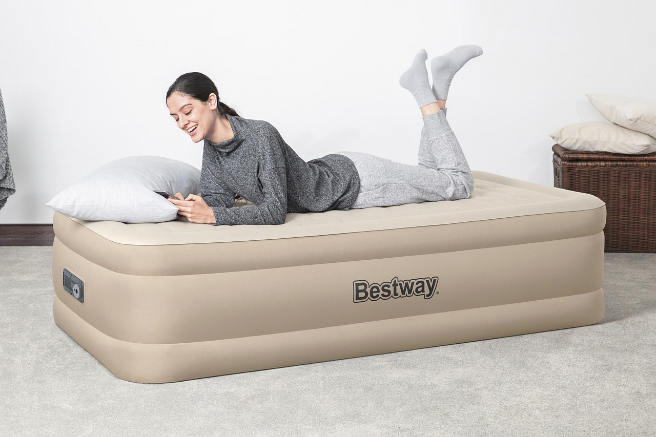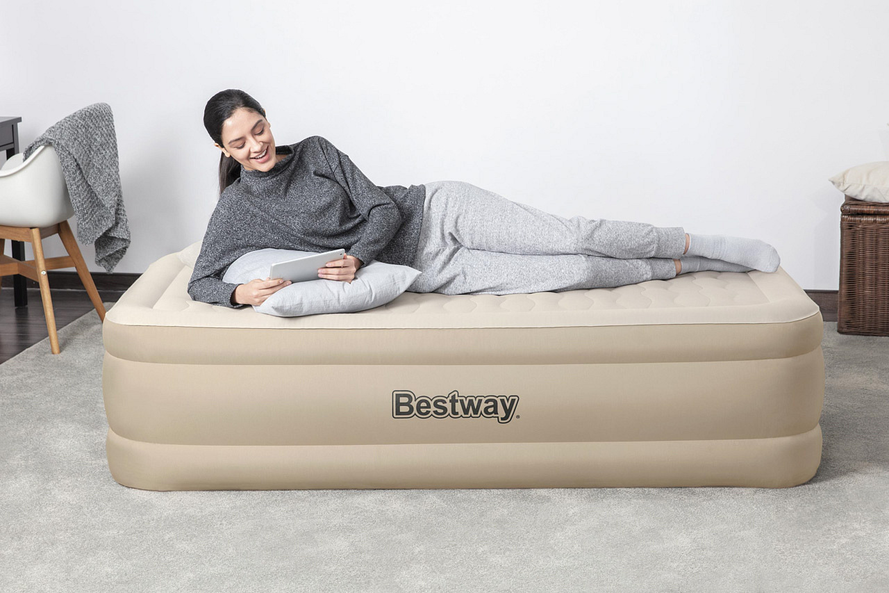Bestway® Nafukovací matrace Fortech™ nabízí vysoký komfort a dlouhou životnost díky inovativnímu materiálu Fortech™, který kombinuje PVC a polyester. Oproti běžnému PVC je až o 10 % lehčí, přitom však o 75 % odolnější proti roztržení, o 92 % méně náchylný k deformaci a až 150x odolnější proti oděru. Speciální tkaná struktura navíc zajišťuje, že povrch není ani příliš horký, ani studený. Luxusní Premium Soft Top™ povrch se dvěma vrstvami zajišťuje měkké ležení, zatímco vnitřní konstrukce podporuje správnou polohu těla a rovnoměrné rozložení tlaku. Rámová konstrukce pomáhá zabránit sklouznutí během spánku. Díky integrované elektrické pumpě je postel nafouknutá za 3–4 minuty a po použití ji snadno vyfouknete a uložíte do přiložené tašky. Vestavěné elektrická pumpa funguje na střídavý proud 220–240 V. Matrace je vhodná pro vnitřní použití. Obsah: 1 nafukovací matrace, 1 úložný vak, 1 opravná záplata. Počet osob: 1. Maximální nosnost: 180 kg. Rozměr nafouknuté matrace: 46 x 97 x 191 cm. Roz