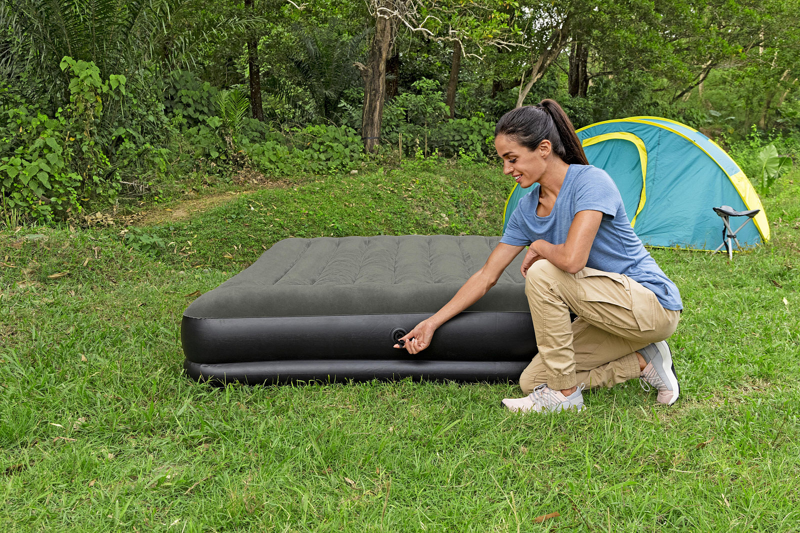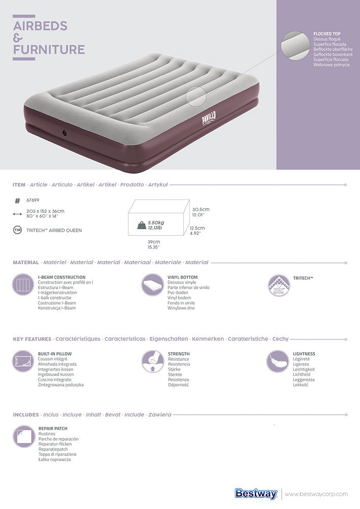 Matrace Bestway® Tritech™ je ideální pro náročné kempování a spaní venku. Vnitřní konstrukce této postele je vyrobena z materiálu Tritech, který nabízí odolnost, pevnost a zároveň umožňuje matraci udržet si stejný tvar bez ohledu na to, kolikrát se nafoukne a vyfoukne. Speciální materiál Tritech zvyšuje vnitřní odolnost proti roztažení a poskytuje tvarovanou podporu pro pohodlí po celou noc a minimalizuje ztráty vzduchu během noci. Tento odolný a zátěžově testovaný materiál odolá veškeré hmotnosti a pohybu. Vestavěný polštář nabízí extra pohodlí. Skvělé pro použití ve vnitřních i vnějších prostorách. Tři možnosti použití: dve samostatné matrace, jedno velké dvoulůžko, extra pohodlná dvojitá matrace. Rozměr balení: 35 x 30,5 x 13 cm.
