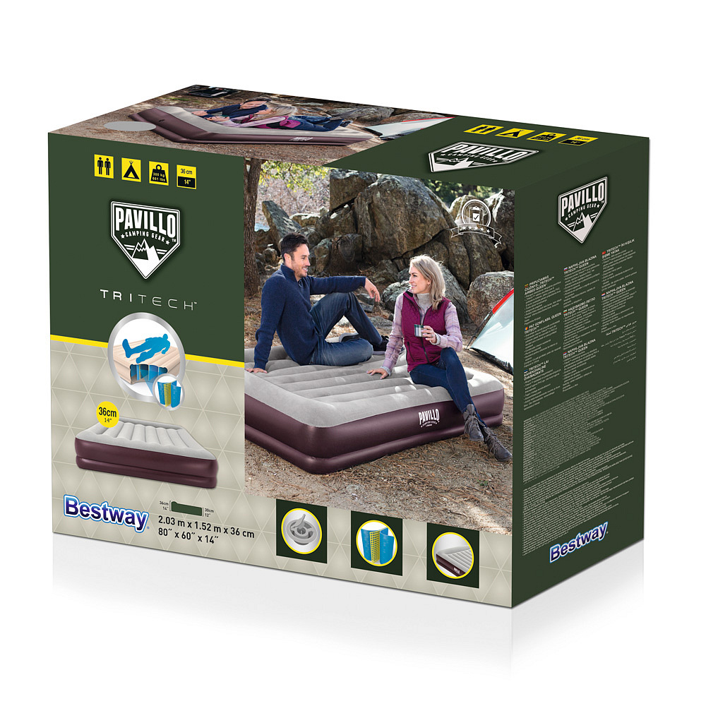 Bestway® Nafukovací matrace TriTech™ Queen nabízí pohodlný a kvalitní spánek doma i na cestách. Díky odolnému materiálu TriTech™ si zachovává tvar, minimalizuje únik vzduchu a zajišťuje dlouhou životnost. Pohodlná ložná plocha s integrovaným polštářem a pevná konstrukce poskytují maximální komfort po celou noc. Praktický obousměrný rychloupínací ventil umožňuje snadné a rychlé nafouknutí i vyfouknutí – pumpa není součástí balení. Ideální jako postel pro hosty, na cesty i kempování. Matrace je vhodná pro vnitřní i venkovní použití. Obsah: 1 nafukovací matrace, 1 opravná záplata. Počet osob: 2. Maximální nosnost: 300 kg. Rozměr nafouknuté matrace: 36 x 150 x 200 cm. Rozměr balení: 30 x 39 x 12,5 cm.