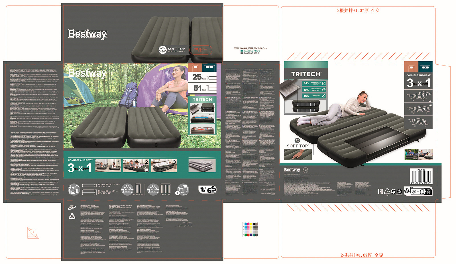Matrace Bestway® Tritech™ je ideální pro náročné kempování a spaní venku. Vnitřní konstrukce této postele je vyrobena z materiálu Tritech, který nabízí odolnost, pevnost a zároveň umožňuje matraci udržet si stejný tvar bez ohledu na to, kolikrát se nafoukne a vyfoukne. Speciální materiál Tritech zvyšuje vnitřní odolnost proti roztažení a poskytuje tvarovanou podporu pro pohodlí po celou noc a minimalizuje ztráty vzduchu během noci. Tento odolný a zátěžově testovaný materiál odolá veškeré hmotnosti a pohybu. Vestavěný polštář nabízí extra pohodlí. Skvělé pro použití ve vnitřních i vnějších prostorách. Tři možnosti použití: dve samostatné matrace, jedno velké dvoulůžko, extra pohodlná dvojitá matrace. Rozměr balení: 35 x 30,5 x 13 cm.