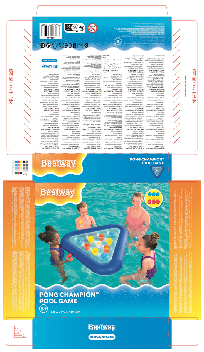Kulečníková hra Pong Champion. Rozměry: 105cm x 97cm. 10 barevně odlišených otvorů na platformě – házejte míček do stejného otvoru a skórujte. 9 herních míčů ve 3 různých barvách pro týmovou hru. Balení: 30 x30 x 6,5cm. Věk: 3+