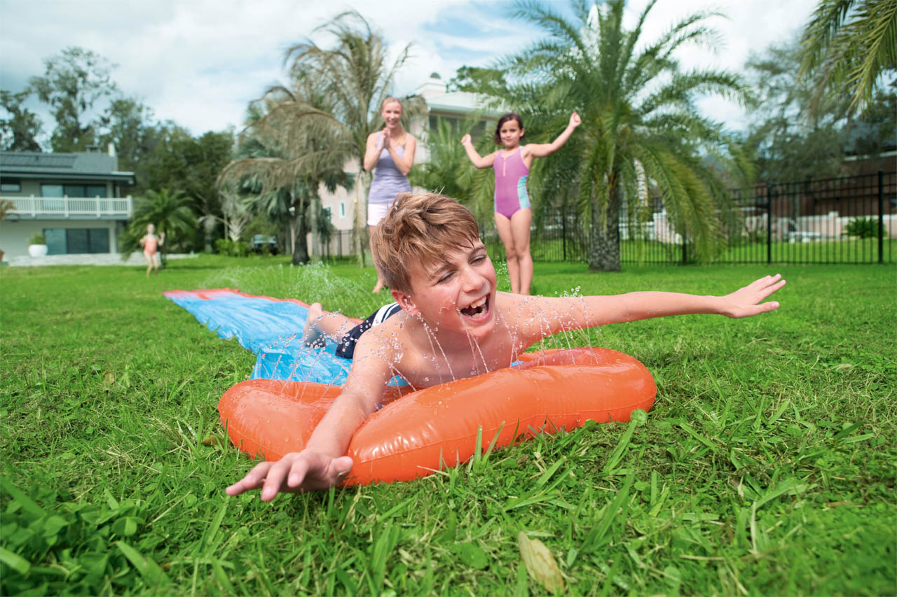 Vodní skluzavka Bestway bude ozdobou vaší zahrady! Připojte se pomocí adaptéru k zahradní hadici a jízda začíná. Téměř pětimetrová skluzavka je ideální pro závodění s kamarády. Na konci skluzavky stéká voda do bazénku, zabudované postřikovače vytvářejí kaskádový efekt a udržují dráhu mokrou. Délka skluzavky: 488 cm. Vyrobeno z kvalitního a odolného vinylu. Skluzavka je vhodná pouze pro domácí použití. UPOZORNĚNÍ. NIKDY NENECHÁVEJTE DÍTĚ BEZ DOZORU – NEBEZPEČÍ UTONUTÍ. POUŽÍVEJTE POUZE POD DOHLEDEM DOSPĚLÉ OSOBY. Balení: 24x24x4,5cm/0,9kg Věk: 3+