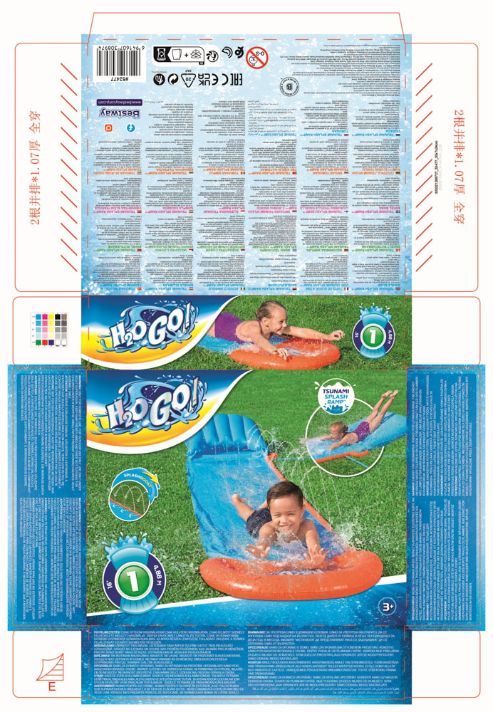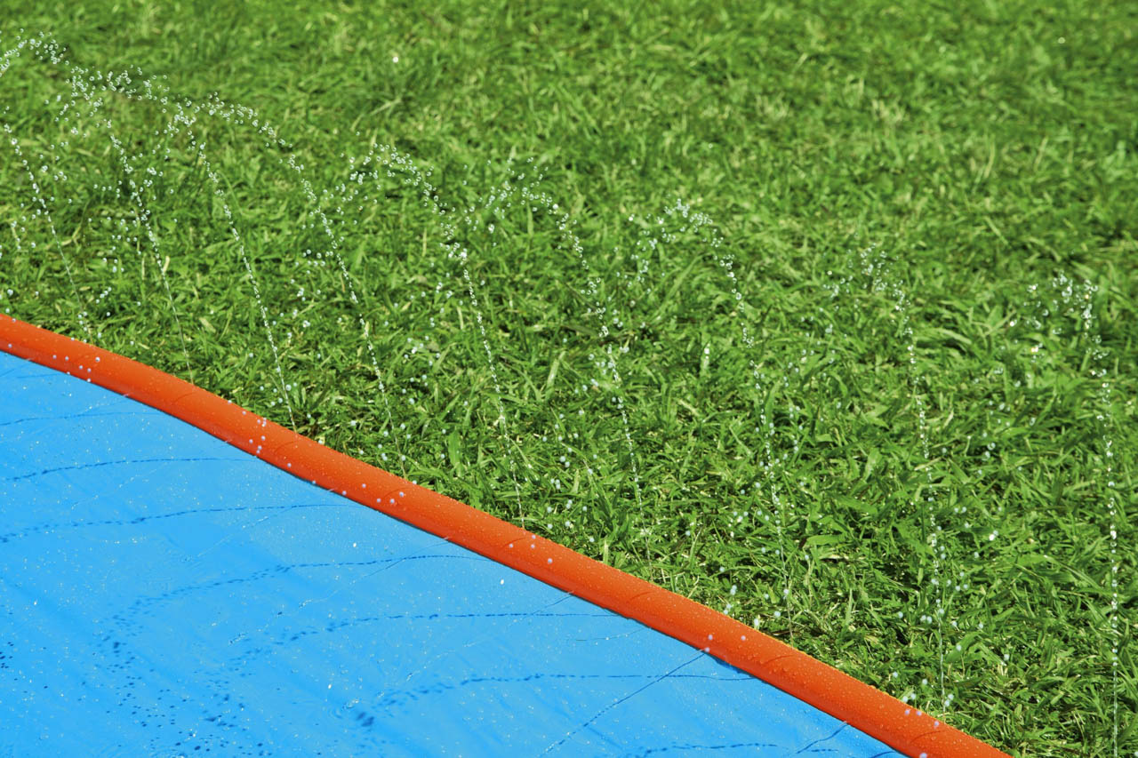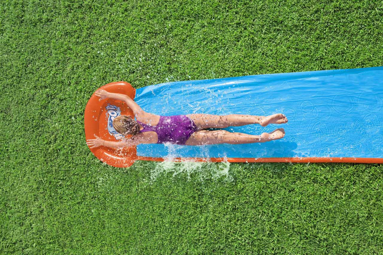 Bestway® H2OGO!® Vodní skluzavka pro 2 osoby 488 x 138 cm. H2OGO!™ nabízí klasickou letní zábavu na zahradě. Díky dvěma dráhám mohou děti závodit na skluzavce. Zabudované zavlažovače SplashBoost™ s připojením na zahradní hadici vytvářejí kaskádový efekt a udržují dráhy kluzké. Na konci skluzavky stéká voda do bazénku, takže v cílí čeká každého mokrá odměna. Součástí skluzavky je vypouštěcí ventil. Děti si užijí hodiny strávené na skluzavce a rodiče ocení, jak snadné je postavit – stačí ho připojit k zahradní hadici a zábava začíná. Vyrobeno z odolného UltraSlick™ PVC. Obsah: 1 nafukovací skluzavka, 1 opravná sada. Délka skluzavky: 488 cm. Šířka skluzavky: 138 cm. Rozměry balení: 30 x 30 x 5 cm. Používejte výhradně venku a pouze pod dohledem dospělé osoby. Věk: 3+