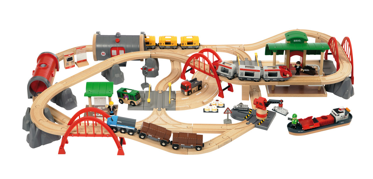 Toto je největší sada vláčkodráhy , která existuje! Velká sada vláčkodráhy se zvuky a světly obsahuje díly pro sestavení dlouhé dráhy kolejí, kterou můžete sestavit i s vyvýšenými úseky. Součástí sady jsou velké mosty, tunely,stanice s výtahem,nákladní vlak,osobní vlak,jeřáb v přístavišti,nákladní loď a figurky. Pomocí světelné a zvukové signalizace se dopraví cestující i náklad bezpečně do svého cíle. S touto detailně zpracovanou vláčkodráhou plnou mechanických a světelných funkcí si Vaše dítě užije spoustu zábavy. Tato souprava je kompatibilní s ostatními dřevěnými vláčkodráhami Brio.