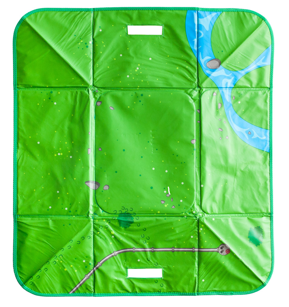 Vláčkodráha je balena v rozkládacím boxu z PVC, který po rozložení slouží jako hrací podložka s motivem přírody. Po rozložení má hrací podložka rozměr 80 x 73 cm