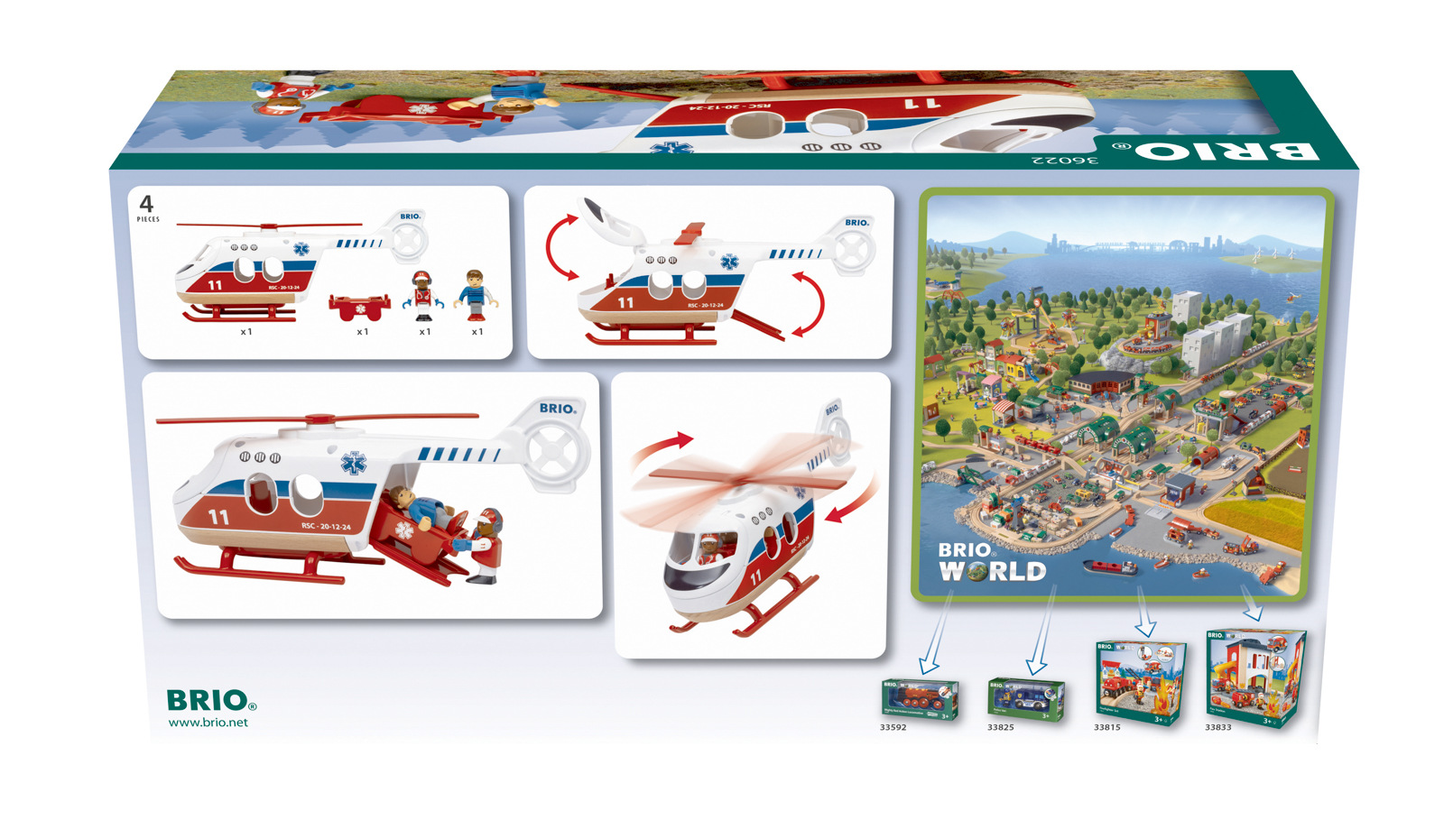 Vydejte se na záchranu se záchranným vrtulníkem! Vrtulník má rotující listy rotoru, otevírací přední a zadní dveře a nosítka. Pilot někdy riskuje život a končetiny, aby pomohl zraněné osobě. Položí pacienta na nosítka a poté nosítka naloží do zadní části vrtulníku, než znovu vzlétne a odletí zpět na základnu. Balení: 20x12,5x27,8cm. Věk: 3+