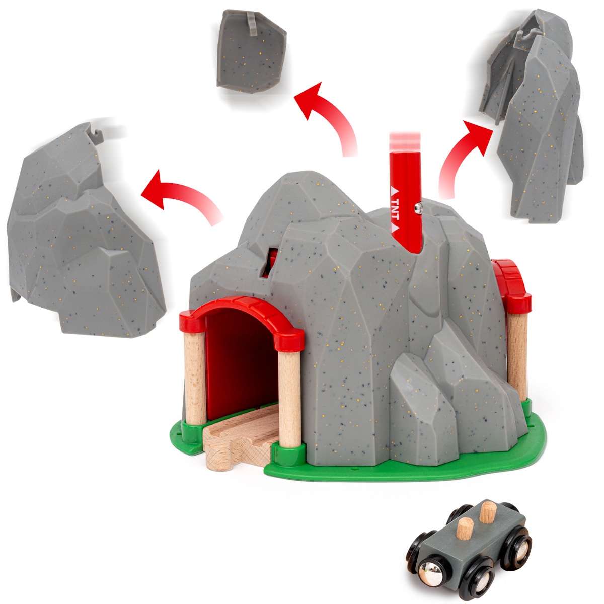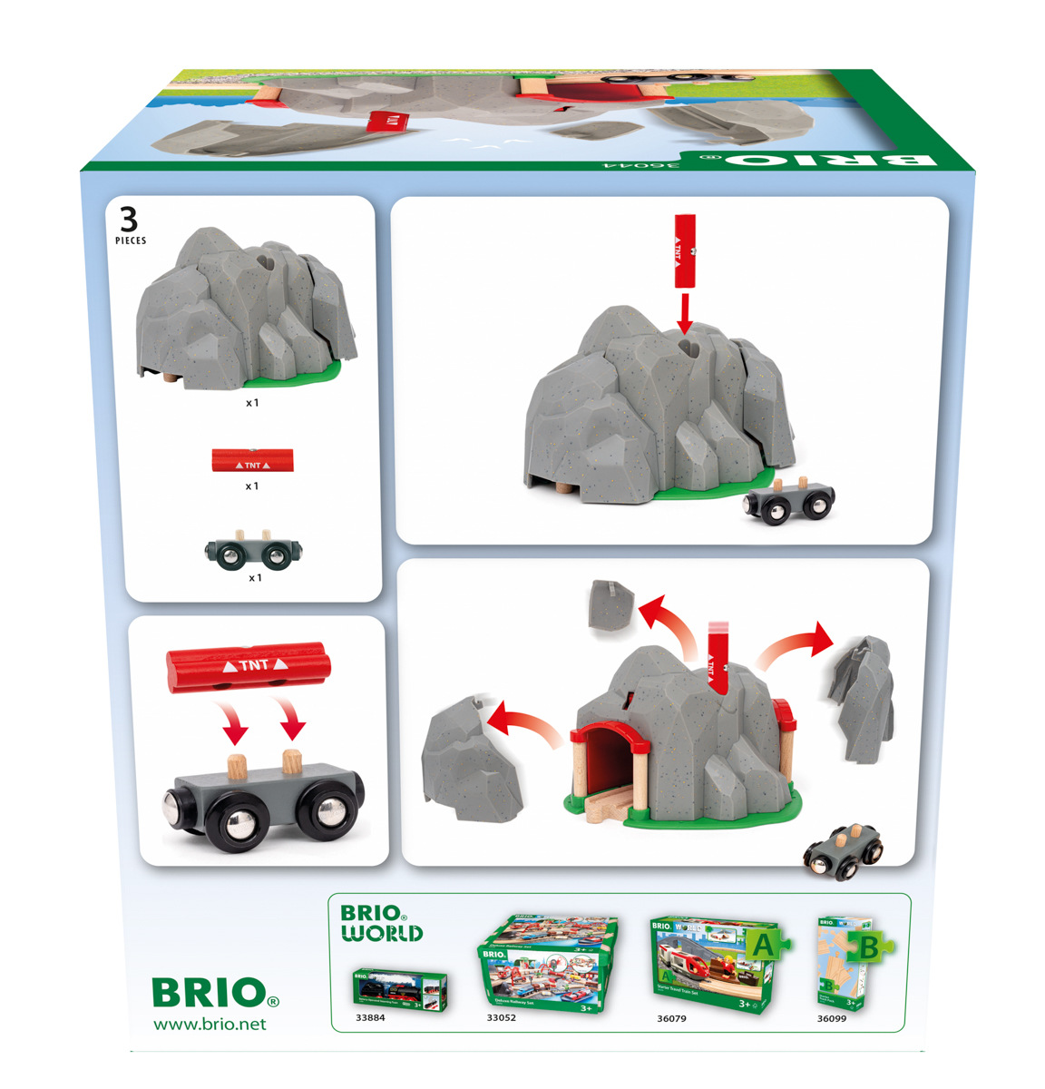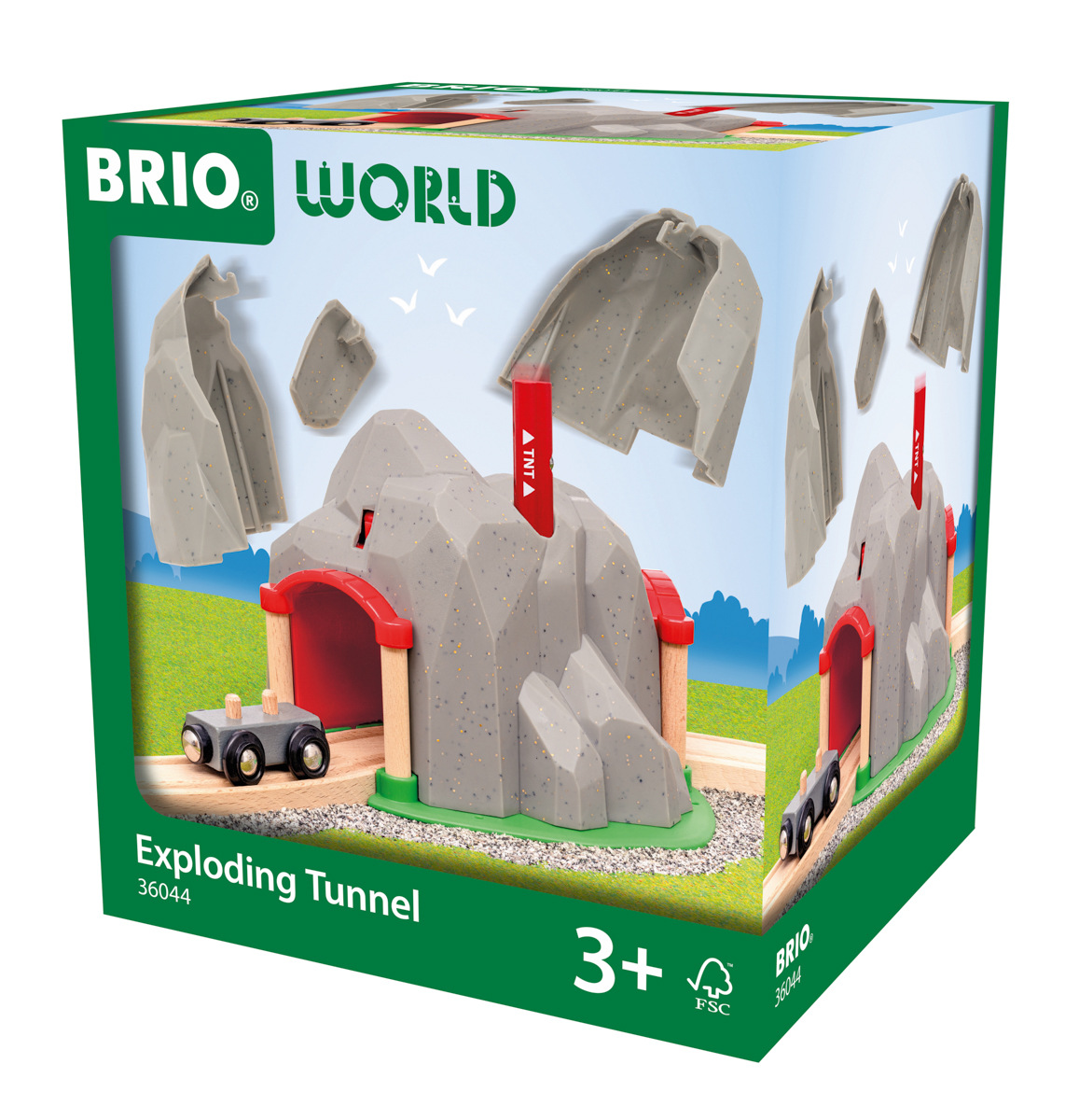 BUM! Vyhoďte horu do povětří a projeďte jejím středem – vybuchujícím tunelem. Velká sada s realistickým kamenným povrchem a skrytým železničním tunelem bude skvělým doplňkem každé sady BRIO World. Do vrtu vložte TNT nálož a sledujte, jak hora exploduje a odhalí tajný tunel. Hračka je vyrobena z robustních plastových a dřevěných dílů a díky průchozí zakřivené dřevěné dráze ji snadno propojíte s ostatními hračkami BRIO World. Vybuchující tunel obsahuje 3 díly: 1× vybuchující tunel s oddělitelnými částmi, 1× TNT nálož a 1× vagon. Rozměry balení: 20 x 18 x 16 cm. Věk: 3+