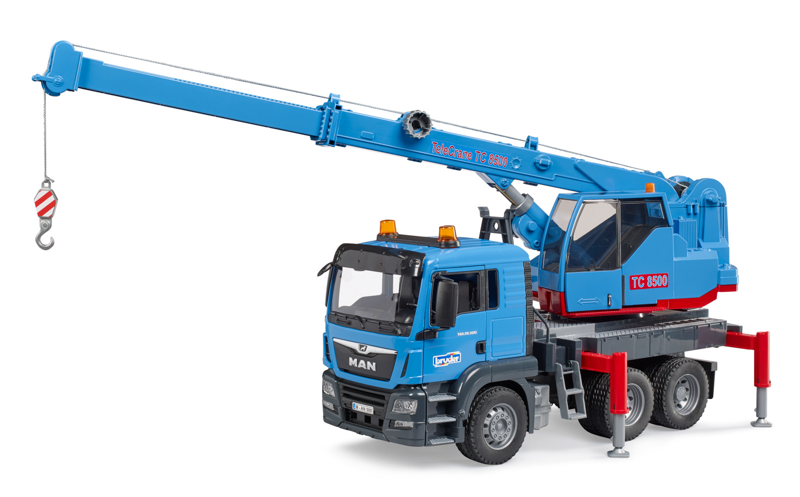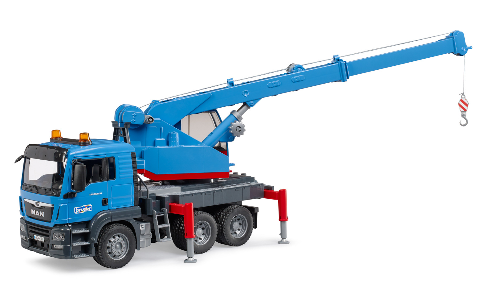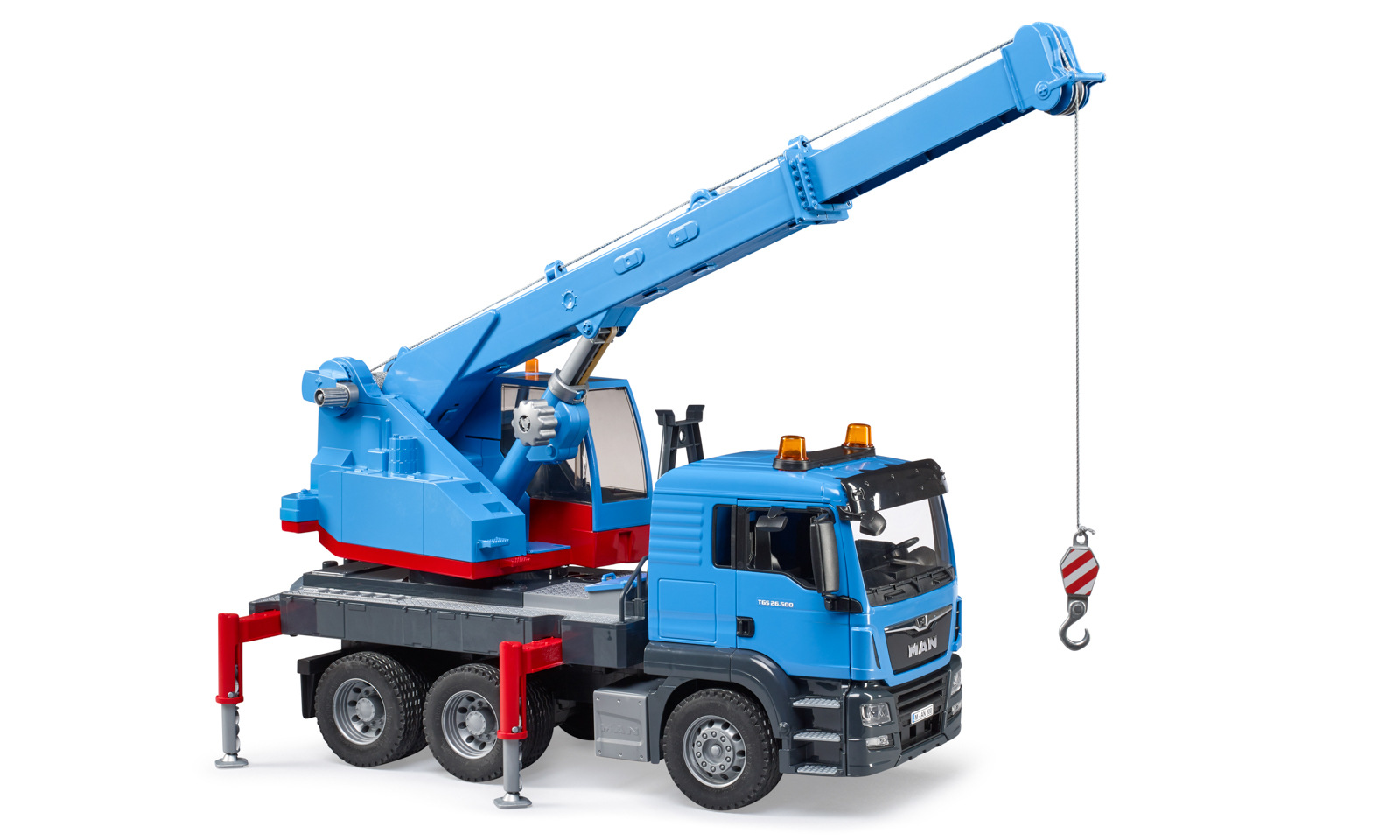 Konstrukční vozy - MAN TGA jeřáb 1:16. Tento jeřáb je vyroben z vysoce kvalitního a odolného plastu. Sklápěcí kabina vozu umožňuje jednoduše nahlédnout do motoru. Venkovní zrcátka lze též snadno sklápět. Jeřábový nástavec je otočný až o 360 stupňů. Výsuvné rameno se může prodloužit a pohodlně ovládat otočným knoflíkem. Navíjecí lano je plně funkční, pro rychlé spouštění je k dispozici odblokovací tlačítko. Jeřáb je vybaven boxem s nářadím a pevnými profilovými pneumatikami. Je vhodný do interiéru a exteriéru. Rozměry: 420 x 240 x 170 mm