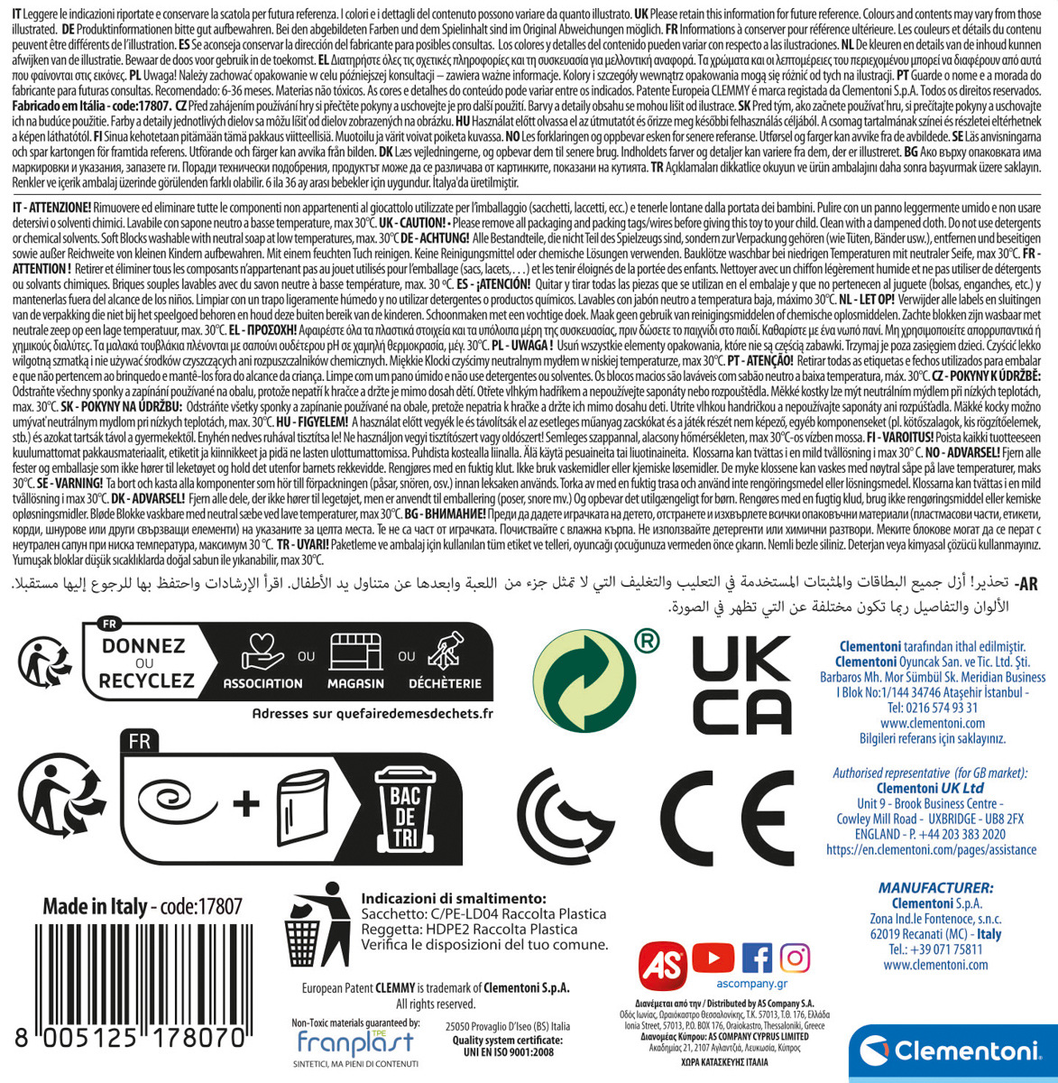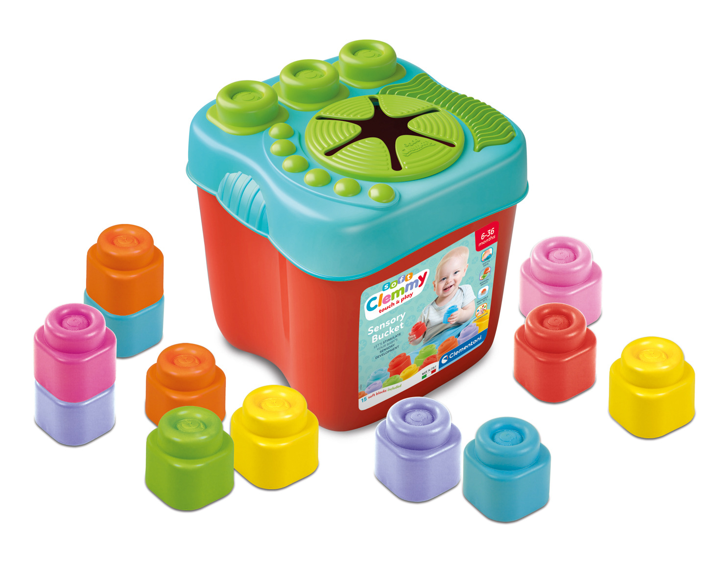 Nový kbelík s měkkým víkem, obohacený o textury a spoje na hraní s 15 přiloženými kostkami. Měkké a barevné kostky pomáhají dítěti rozvíjet zručnost a hmatové a zrakové vnímání. Nové víko je součástí hry, kostky lze naskládat na štěrbiny nebo je lze vložit do kbelíku otvorem ve tvaru květiny. Clemmy jsou ideální pro podporu multismyslového vývoje dítěte. Rozměry balení: 30x21x42,5cm. Věk:6m+