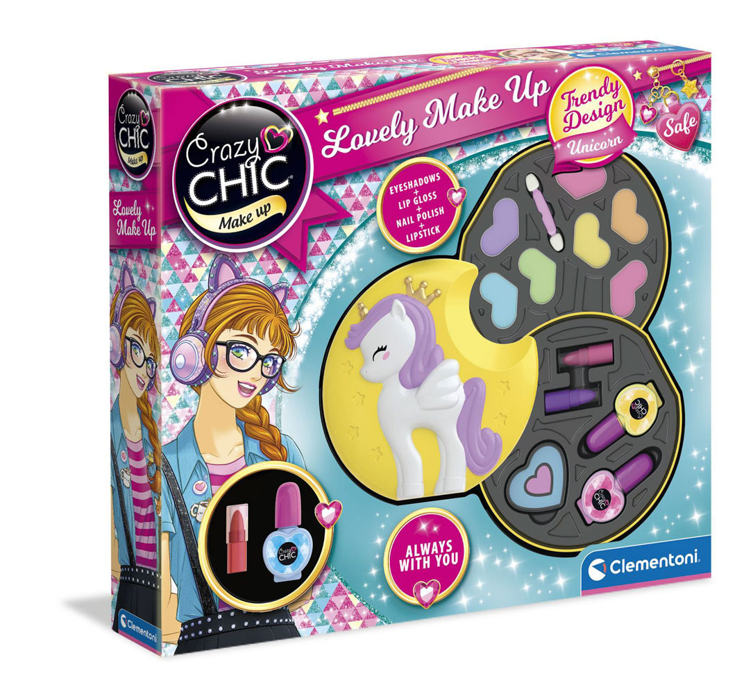 Exkluzivní dvoukazetová make - up sada Crazy CHIC ve tvaru jednorožce je super kompaktní, s paletou jemných odstínů pro přirozený a trendy vzhled. Paleta barev obsahuje 7 očních stínů, 3 rtěnky, aplikátor na oční stíny, 3 laky na nehty a lesk na rty ve tvaru srdíčka. Sada stimuluje kreativitu a manuální dovednost mladých dívek v oblasti krásy a kosmetiky. Rozměry balení: 30 x 34 x 6 cm. Věk: 6+