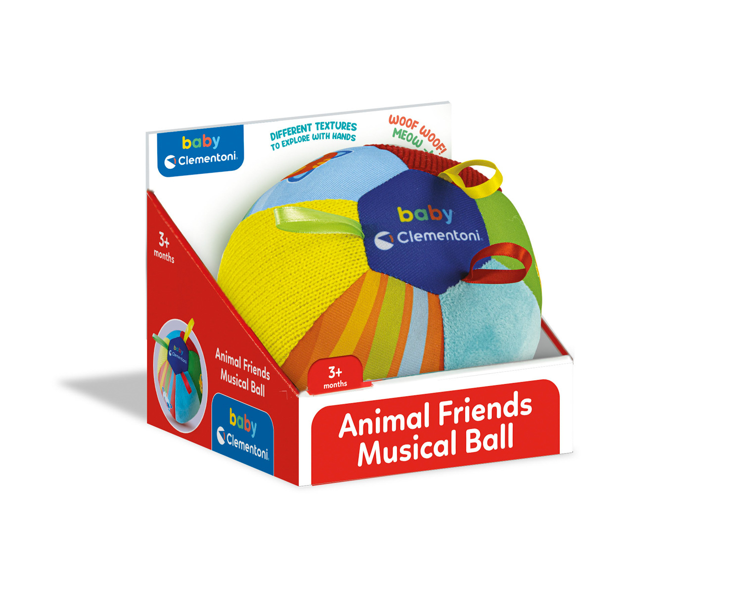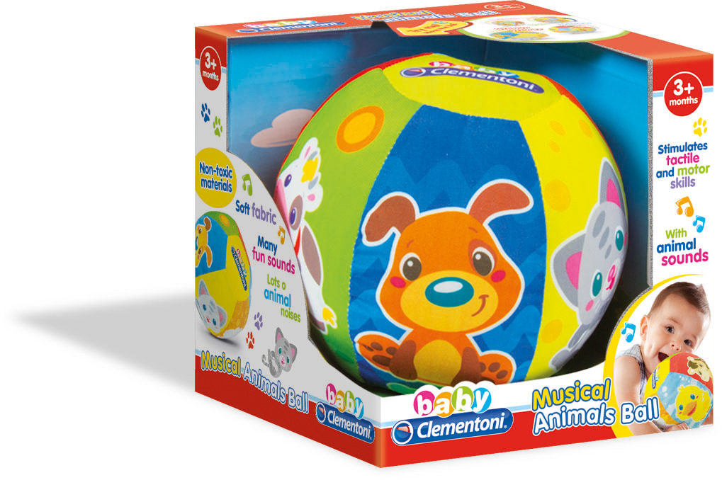 Hudební míček Clementoni Baby je vyroben z měkkého materiálu s obrázky zvířat. Míček při hře vydává různé zvířecí zvuky. Měkká tkanina s různou texturou a barevností podporuje vývoj manuálních dovedností a hmatového vnímání. Hračka dále podporuje koordinační a reflexní dovednosti a časoprostorové vnímání. Vyrobeno z bezpečných materiálů. Vhodné pro děti od 3 měsíců. Rozměr balení: 16 x 16 x 16 cm. Baterie: 3xLR44 (součástí výrobku jsou baterie pouze demonstrativní účely).