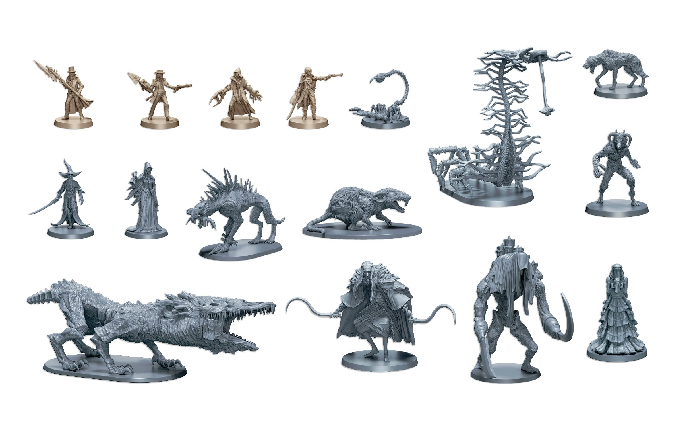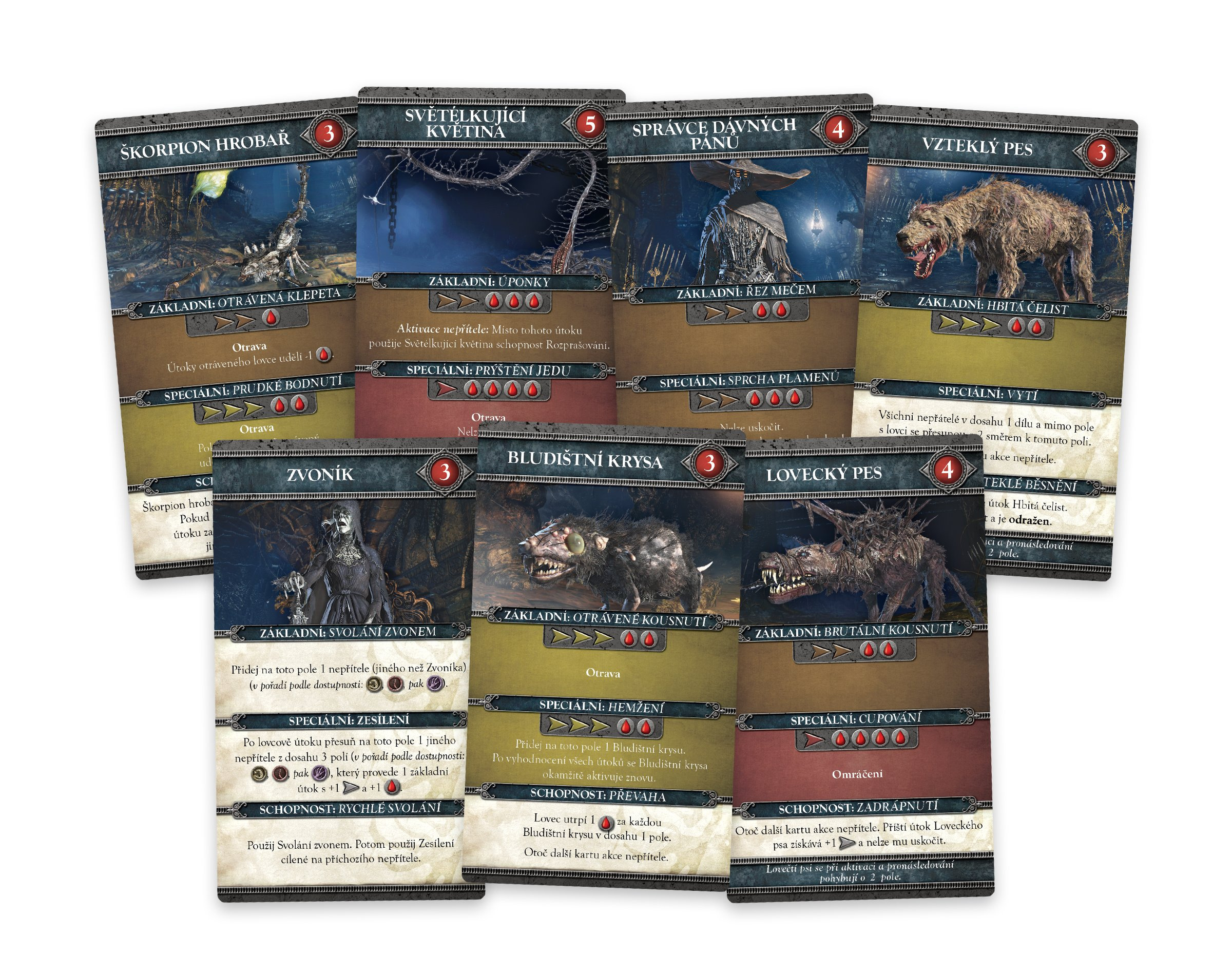 Obsah balení: 4 figurky lovců 26 figurek nepřátel 5 figurek bossů 12 dílů mapy 4 herní zástěny 4 panely trikových zbraní 4 karty střelných zbraní 5 karet zdraví bossů 50 karet akcí bossů 7 karet nepřátel 9 karet rituálů Kalicha 1 karta přípravy 20 karet pastí Kalicha 1 pravidla hry