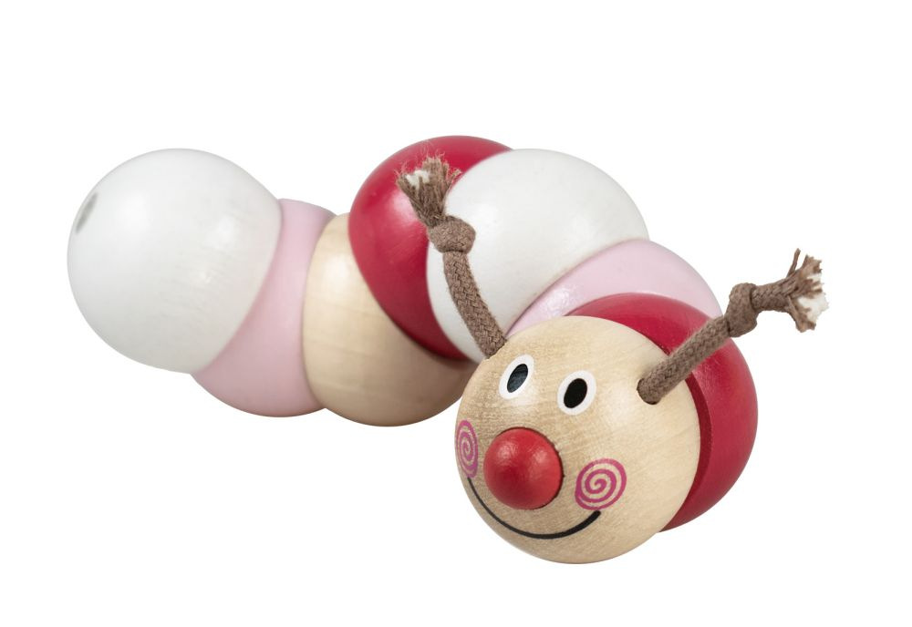Hračka v podobě housenky z barevných dřevěných perlí navlečených na gumě, které se pohybují, točí a
